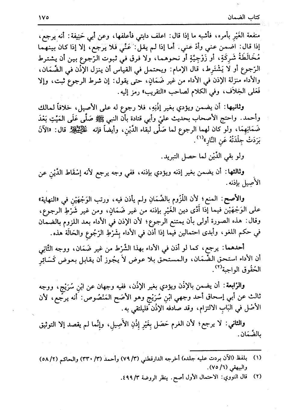 وثانيها: أن يضمن ويؤدي بغير إذْنِهِ، فلا رجوع له على الأصيل، خلافاً لمالك وأحمد. واحتج الأصحاب بحديث عليّ وأبي قتادة بأن النبي -صلى الله عليه وسلم- صَلَّى عَلَى المَيِّتِ بَعْدَ ضَمَانِهِمَا, ولو كان لهما الرجوع لما صَلَّى لبقاء الدَّيْنِ، وأيضاً فإنه عليه السلام قال: "الآنَ بَرَدَتْ جِلْدَتُهُ عَنِ النَّارِ" (¬1).