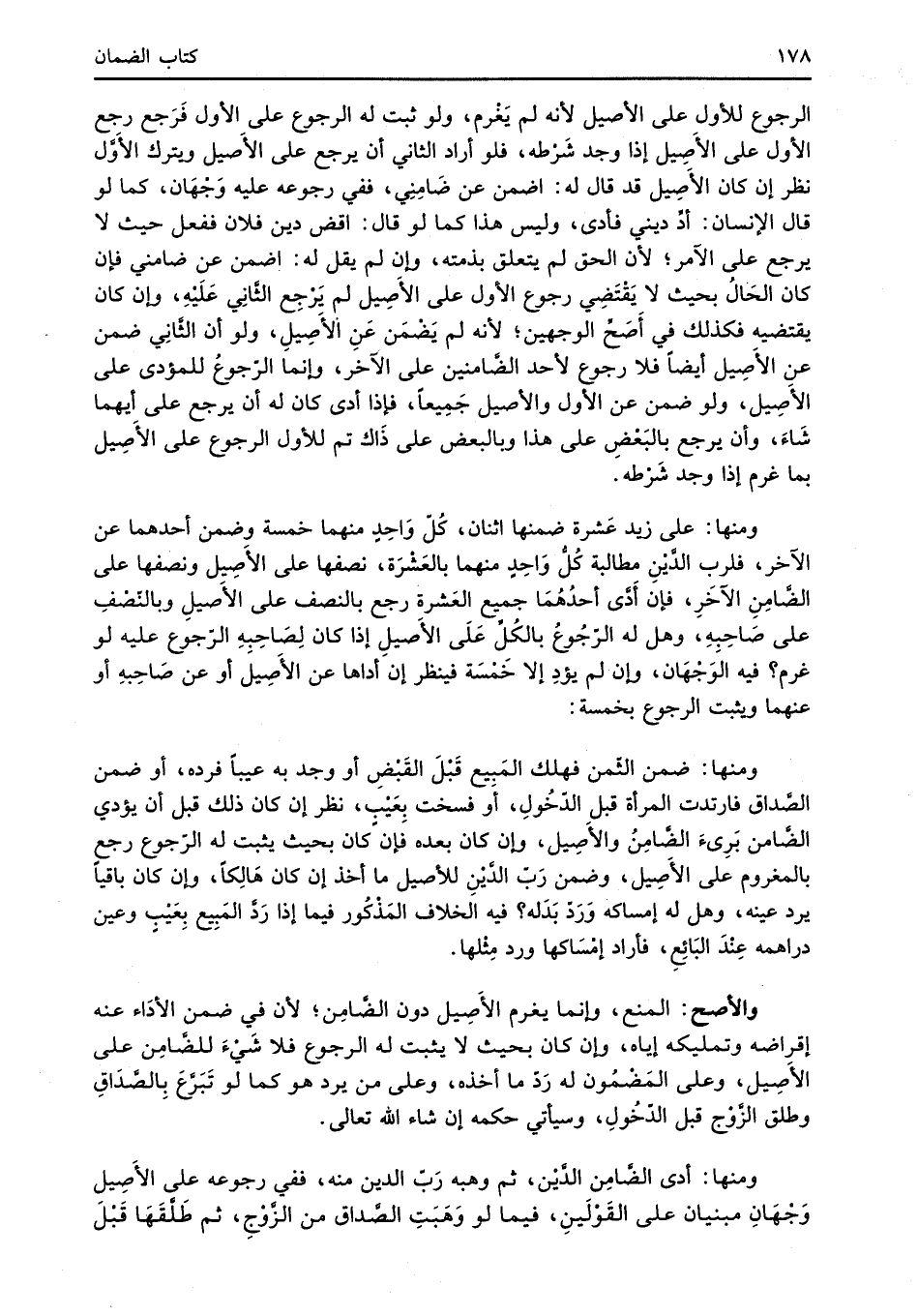 ومنها: ضمن الثّمن فهلك المَبيع قَبْلَ القَبْضِ أو وجد به عيباً فرده، أو ضمن الصَّداق فارتدت المرأة قبل الدّخُولِ، أَو فسخت بِعَيْبٍ، نظر إن كان ذلك قبل أن يؤدي الضَّامن بَرِئَ الضَّامِنُ والأَصِيل، وإن كان بعده فإن كان بحيث يثبت له الرّجوع رجع بالمغروم على الأَصِيل، وضمن رَبّ الدَّيْنِ للأصيل ما أخذ إن كان هَالِكاً، وإن كان باقياً يرد عينه، وهل له إمساكه وَرَدّ بَدَله؟ فيه الخلاف المَذْكُور فيما إذا رَدَّ المَبِيع بِعَيْبٍ وعين دراهمه عِنْدَ البَائِعِ، فأراد إمْسَاكها ورد مِثْلها.