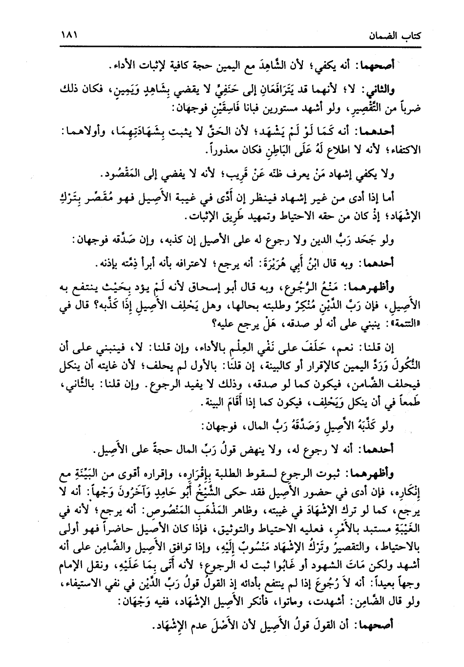 وأظهرهما: ثبوت الرجوع لسقوط الطلبة بإقْرَارِه، وإقراره أقوى من البَيِّنَةِ مع إِنْكَارِه، فإن أدى في حضور الأَصِيل فقد حكى الشَّيْخُ أبُو حَامِدٍ وَآخَرُونَ وَجْهاً: أنه لا يرجع، كما لو ترك الإشْهَادَ في غيبته، وظاهر المَذْهَبِ المَنْصُوصِ: أنه يرجع؛ لأنه في الغَيْبَةِ مستبد بالأَمْرِ، فعليه الاحتياط والتوثيق، فإذا كان الأصيل حاضراً فهو أولى بالاحتياط، والتقصيرُ وتَرْكُ الإشْهَاد مَنْسُوبٌ إِلَيْهِ، وإذا توافق الأَصِيل والضَّامِن على أنه أشهد ولكن مَاتَ الشهود أو غَابُوا ثبت له الرجوع؛ لأنه أَتَي بمَا عَلَيْهِ، ونقل الإمام وجهاً بعيداً: أنه لاَ رُجُوعَ إذا لم ينتفع بادائه إذ القولُ قولُ رَبِّ الدَّيْن في نفي الاستيفاء، ولو قال الضَّامِن: أشهدت، وماتوا، فأنكر الأَصِيل الإشْهَاد، ففيه وَجْهَان: