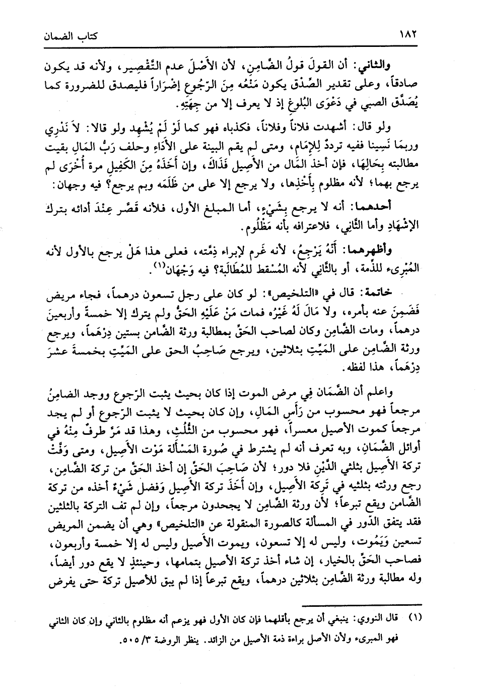 واعلم أن الضَّمَان في مرض الموت إذا كان بحيث يثبت الرّجوع ووجد الضامِنُ مرجعاً فهو محسوب من رَأَسِ المَالِ، وإن كان بحيث لا يثبت الرّجوع أو لم يجد مرجعاً كموت الأصيل معسراً، فهو محسوب من الثُّلُثِ، وهذا قد مَرَّ طرفٌ مِنْهُ في أوائل الضَّمَانِ، وبه تعرف أنه لم يشترط في صُورة المسألة مَوْت الأَصِيل، ومتى وَفَّتْ تركة الأَصِيل بثلثي الدَّيْنِ فلا دور؛ لأن صَاحِبَ الحَقِّ إن أخذ الحَقَّ من تركة الضَّامِن، رجع ورثته بثلثيه في تَرِكة الأَصِيل، وإن أَخَذَ تركة الأَصِيل وَفضل شَيْءٌ أخذه من تركة الضَّامن ويقع تبرعاً؛ لأن ورثة الضَّامِن لا يجحدون مرجعاً، وإن لم تف التركة بالثلثين فقد يتفق الدّور في المسألة كالصورة المنقولة عن "التلخيص" وهي أن يضمن المريض تسعين وَيَمُوت، وليس له إلا تسعون، ويموت الأَصيل وليس له إلا خمسة وأربعون، فصاحب الحَقِّ بالخيار، إن شاء أخذ تركة الأصيل بتمامها، وحينئذِ لا يقع دور أيضاً، وله مطالبة ورثة الضامِن بثلاثين درهماً، ويقع تبرعاً إذا لم يبق للأصيل تركة حتى يفرض