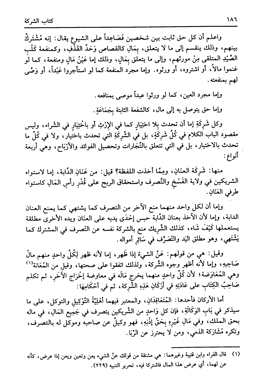 وكل شَرِكَةِ إما أن تحدث بِلا اختِيَارٍ كما في الإِرْثِ أو باخْتِيَارٍ في الشّراء، وليس مقصود الباب الكلام في كُلِّ شَرِكَةٍ، بل في الشَّرِكَةِ التي تحدث باختيار، ولا في كُلِّ ما تحدث بالاختيار، بل في التي تتعلق بالتِّجَارات وتحصيل الفوائد والأرْبَاح، وهي أربعة أنواع: