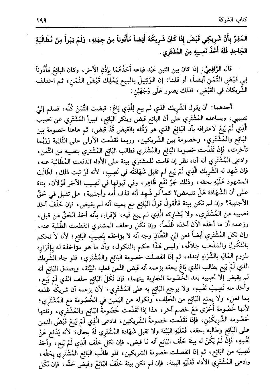 أحدهما: أن يقول الشَّرِيك الذي لم يبع لِلَّذي بَاعَ: قبضت الثَّمَنَ كُلَّه، فسلم إليَّ نصيبي، ويساعده المُشْتَرِي على أن البائع قبض وينكر البَائِع، فيبرأ المُشْتَرِي عن نصيب الَّذِي لَمْ يَبعْ لاعترافه بأن البَائِعَ الذي هو وَكَّله بالقبض قَدْ قبض، ثم هاهنا خصومة بين البَائِع والمُشْتَري، وخصومة بين الشَّريكين، وربما تَقدَّمت الأولى على الثَّانِية وَرُبَّما تأخرت، فَإِنْ تَقَدَّمت خصومة البَائِع والمشْتَري فطالب البَائِع المُشْتري بنصيبه من الثَّمَن، وادعى المُشْتَرِي أنه أداه نظر إن قامت للمشتري بينة على الأداء اندفعت المُطَالبة عنه، فإن شَهِد له الشَّرِيك الَّذِي لَمْ يَبع لم تقبل شَهَادَتُه في نَصِيبِهِ؛ لأنه لَوْ ثبت ذلك، لطَالَبَ المشهود عَلَيْهِ بحقه، وذلك جَرَّ نَفْعٍ ظَاهِر، وفي قبولها في نَصِيب الآخر قَوْلاَن، بناءً على أن الشَّهَادَة هَلْ تتبعض؛ كماَ لو شَهِد أنه قذف أُمه وأجنبية، هل تقبل في حَقِّ الأجنبية؟ وإن لم تكن بينة فَالْقولُ قولُ البَائِع مع يمينه أنه لم يقبض، فإن حَلَفَ أخذ نصيبه من المُشْتَرِي، ولا يُشَارِكه الَّذِي لم يبع فيه، لإقراره بأنه أخذ الحَقَّ من قبل، وزعمه أن ما أخذه الآن أخذه ظُلْماً، وإن نَكَل وحلف المشتري انقطعت الطَّلبة عنه، وإن نكل المُشْتَرِي أيضاً فعن ابْنِ القَطَّانِ وجه أنه لا يؤاخذه بِنَصِيبِ البَائِع؛ لأنا لاَ نحكم بالنّكُولِ والمَذْهب خِلاَفُه، وليس هَذَا حكم بالنكول، وأن ما هو مؤاخذة له بإِقْرَارِه بلزوم المَالِ بالشَّرَاءِ ابتداء، ثم إذا انفصلت خصومة البَائِع والمُشْتَري، فلو جاء الشَّرِيك الذي لَمْ يَبع يطالب الذي بَاعَ بحقه بزعمه أنه قبض الثَّمن فعليه البَيِّنَة، ويصدق البَائِع أنه لم يقبض إلا نَصِيبه بعد الخُصُومة الجَارِية بينهما، فإن نَكَلَ البَائِع حلف الذي لَمْ يَبع، وأخذ منه نَصِيبَ نَفْسِهِ، ولا يرجع البَائِع به على المُشْتَرِي؛ لأن بزعمه أن شريكه ظلمه بما فعل، ولا يمنع البَائِع من الحَلِف، ونكوله عن اليَمين في الخُصُومة مع المُشْتَرِي؛ لأنها خصُومة أُخْرَى مَعَ خصم آخر، هذا إذا تَقَدَّمت خُصُومةُ البَائِع والمُشْتَرِي، وتلتها خُصُومه الشَّرِيكَيْنِ، فهذا تَقَدَّمت خصومةُ الشَّريكين، فادعى الَّذِي لَمْ يَبعْ قَبْضَ الثمن على البَائِع وطالبه بحقه، فَعَلَيْهِ البَيِّنَة ولا تقبل شَهَادة المُشْتَرِي لَهُ بحال؛ لأنه يَدْفع عَنْ نَفْسِهِ، فَإِنْ لَمْ يَكُنْ له بينة حَلَف البَائع أنه مَا قبض، فإن نكل حَلَف الَّذِي لَمْ يَبع، وأخذ نَصِيبَه من البَائِع، ثم إذا انفصلت خصومة الشريكين، فلو طالب البَائِع المُشْتَرِي بِحَقِّه، وادعى المُشْتَرِي الأداء فَعَلَيْهِ البينة، فإن لم تكن بينة حَلَفَ البَائِعُ وقبض حَقَّه، فإن نَكَل