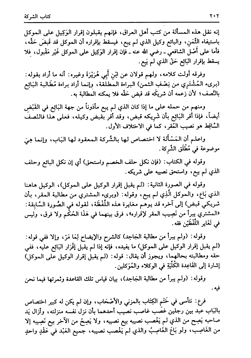 وقوله في الصورة الثانية: (لم يقبل إقرار الوكيل على الموكل)، الوكيل هاهنا الذي بَاع، والموكل الَّذِي لم يبع، وقوله: (وبرئ المشتري من مطالبة المقر، بأن شريكي قبض) إلى آخره قد يوهم مغايرة هذه اللَّفْظَة، لقوله في الصُّورة السَّابِقة: "المشتري يبرأ من نَصِيب المقر لإقراره"، فرق بينهما في هَذَا الحُكْم ولا فرق، وَليس في تَغَاير اللَّفْظَيْن فقه.