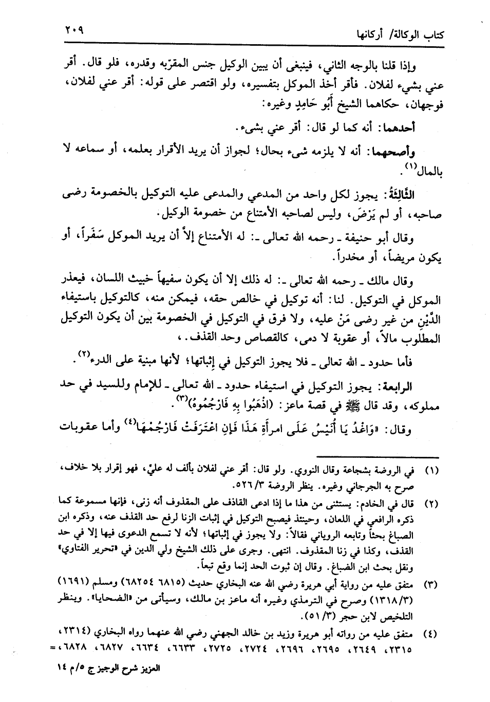الرابعة: يجوز التوكيل في استيفاء حدود -الله تعالى- للأمام وللسيد في حد مملوكه، وقد قال -صلى الله عليه وسلم- في قصة ماعز: (اذْهَبُوا بِهِ فَارْجُمُوهُ) (¬3).