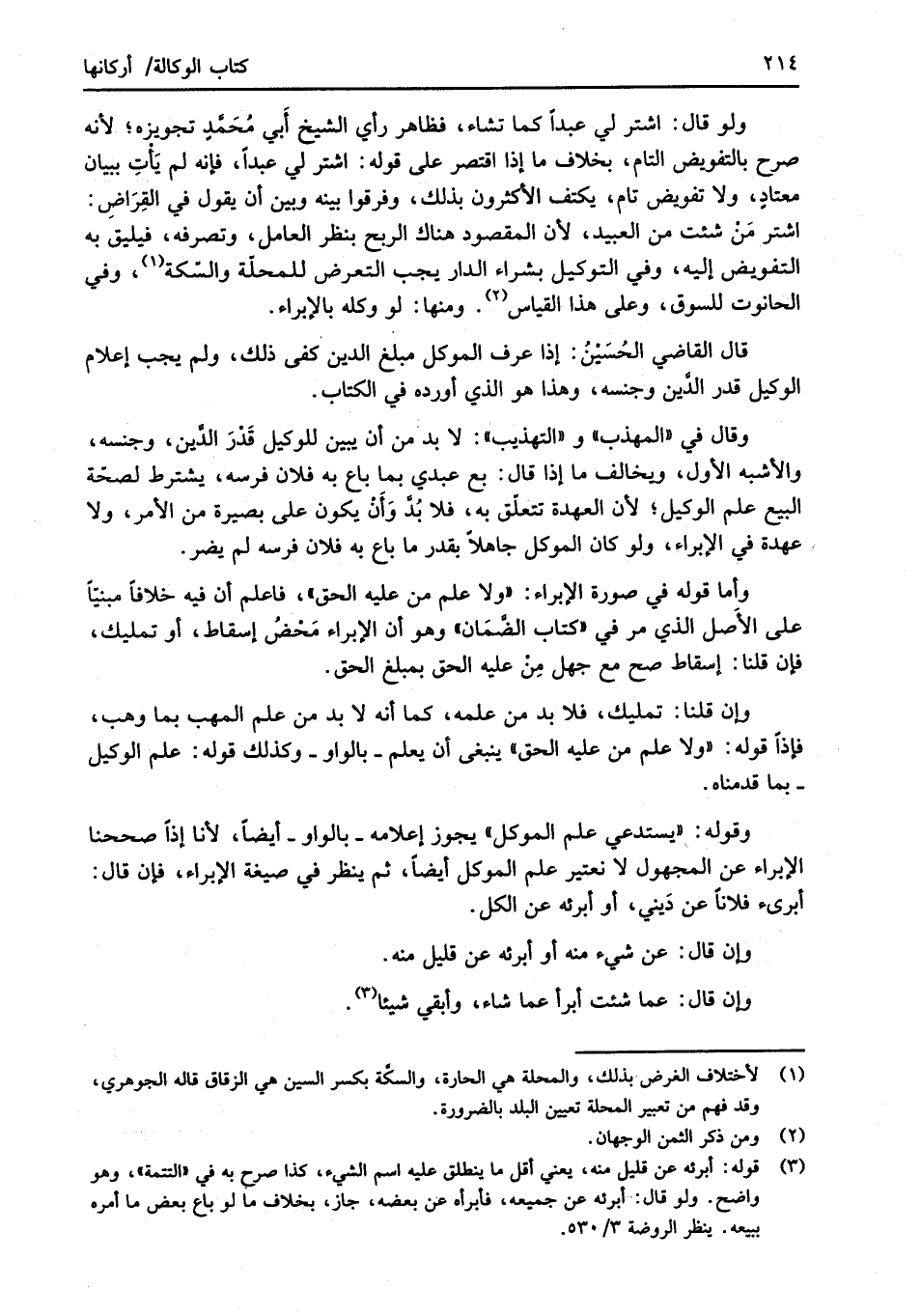 ولو قال: اشتر لي عبداً كما تشاء، فظاهر رأي الشيخ أَبي مُحَمَّدٍ تجويزه؛ لأنه صرح بالتفويض التام، بخلاف ما إذا اقتصر على قوله: اششر لي عبداً، فإنه لم يَأْتِ ببيان معتادٍ، ولا تفويض تام، يكتف الأكثرون بذلك، وفرقوا بينه وبين أن يقول في القِرَاضِ: اشتر مَنْ شئت من العبيد؛ لأن المقصود هناك الربح بنظر العامل، وتصرفه، فيليق به التفويض إليه، وفي التوكيل بشراء الدار يجب التعرض للمحلّة والسّكة (¬1)، وفي الحانوت للسوق، وعلى هذا القياس (¬2). ومنها: لو وكله بالإبراء.