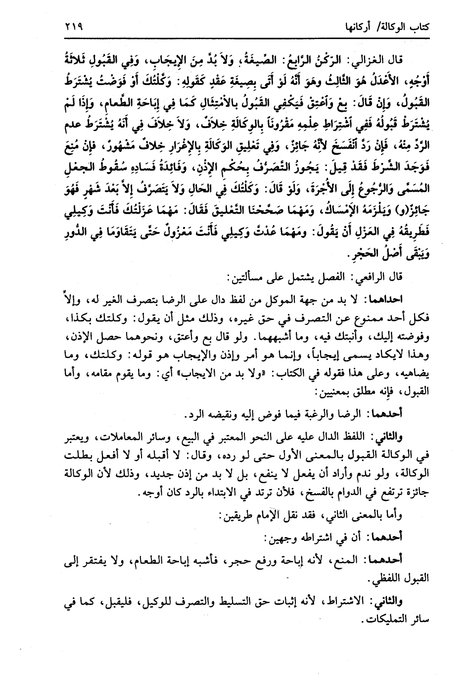 قال الغزالي: الرّكْنُ الرَّابعُ: الصِّيغَةُ، وَلاَ بُدَّ مِنَ الإِيجَابِ، وَفِي القَبُولِ ثَلاَثَةُ أَوْجُهٍ، الأعْدَلُ هُوَ الثَّالِثُ وهَوَ أَنَّهُ لَوْ أَتَى بِصِيغَةِ عَقْدٍ كَقَولِهِ: وَكَّلْتُكَ أَوْ فَوَضْتُ يُشْتَرَطُ القَبُولُ، وَإِنْ قَالَ: بعْ وَاعْتِقْ فَيَكْفِي القَبُولُ بالامْتِثَالِ كَمَا فِي إِبَاحَةِ الطَّعامِ، وَإِذَا لَمْ يُشْتَرَطْ قَبُولُهُ فَفِي اشْتِرَاطِ عِلْمِهِ مَقْرُونَاً بِالوِكَالَةِ خِلاَفٌ، وَلاَ خِلاَفَ فِي أَنَّهُ يُشْتَرَطُ عدم الرَّدِّ مِنْهُ، فَإِنْ رَدَّ انْفَسَخَ لأِنَّهُ جَائِزٌ، وَفِي تَعْلِيقِ الوَكَالَةِ بِالإِغْرَارِ خِلافٌ مَشْهُورٌ، فإِنْ مُنِعَ فَوَجَدَ الشَّرْطَ فَقَدْ قِيلَ: يَجُوزُ التَّصَرُّفُ بِحُكْمِ الإِذْنِ، وَفَائِدَةُ فَسَادِهِ سُقُوطُ الجعْلِ المُسَمَّى وَالرُّجُوعُ إِلَى الأُجْرَةَ، وَلَوْ قَالَ: وَكَلْتُكَ فِي الحَالِ وَلاَ يَتَصَرَّفُ إِلاَّ بَعْدَ شَهْرٍ فَهُوَ جَائِزٌ (و) وَيَلْزَمَهُ الإِمْسَاكُ، وَمَهْمَا صَحَّحْنَا التَّعْليقَ فَقَالَ: مَهْمَا عَزَلْتُكَ فَأَنْتَ وَكِيلِي فَطَرِيقُهُ فِي العَزْلِ أنْ يَقُولَ: ومَهْمَا عُدْتَّ وَكِيلِي فَأَنْتَ مَغْزُولٌ حَتَّى يَتَقَاوَمَا فِي الدُّورِ وَيَبْقَى أَصْلُ الحَجْرِ.