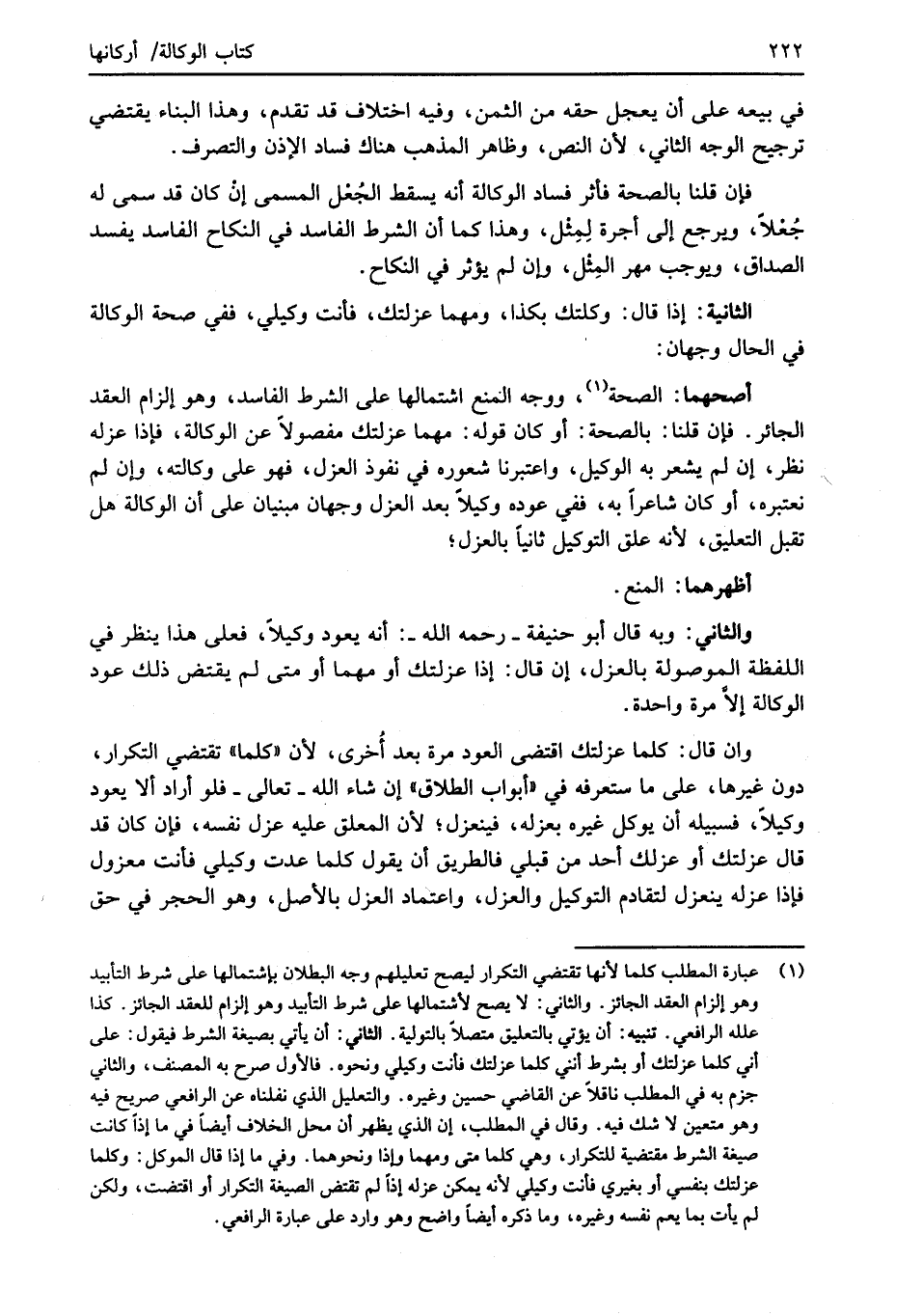 (¬1) عبارة المطلب كلما لأنها تقتضي التكرار ليصح تعليلهم وجه البطلان بإشتمالها على شرط التأبيد وهو إلزام العقد الجائز. والثاني: لا يصح لأشتمالها على شرط التأبيد وهو إلزام للعقد الجائز. كذا علله الرافعي. تنبيه: أن يؤتي بالتعليق متصلاً بالتولية. الثاني: أن يأتي بصيغة الشرط فيقول: على أني كلما عزلتك أو بشرط أنني كلما عزلتك فأنت وكيلي ونحوه. فالأول صرح به المصنف، والثاني جزم به في المطلب ناقلاً عن القاضي حسين وغيره. والتعليل الذي نفلناه عن الرافعي صريح فيه وهو متعين لا شك فيه. وقال في المطلب، إن الذي يظهر أن محل الخلاف أيضاً في ما إذا كانت صيغة الشرط مقتضية للتكرار، وهي كلما متى ومهما وإذا ونحوهما. وفي ما إذا قال الموكل: وكلما عزلتك بنفسي أو بغيري فأنت وكيلي لأنه يمكن عزله إذا لم تقتض الصيغة التكرار أو اقتضت، ولكن لم يأت بما يعم نفسه وغيره، وما ذكره أيضاً واضح وهو وارد على عبارة الرافعي.