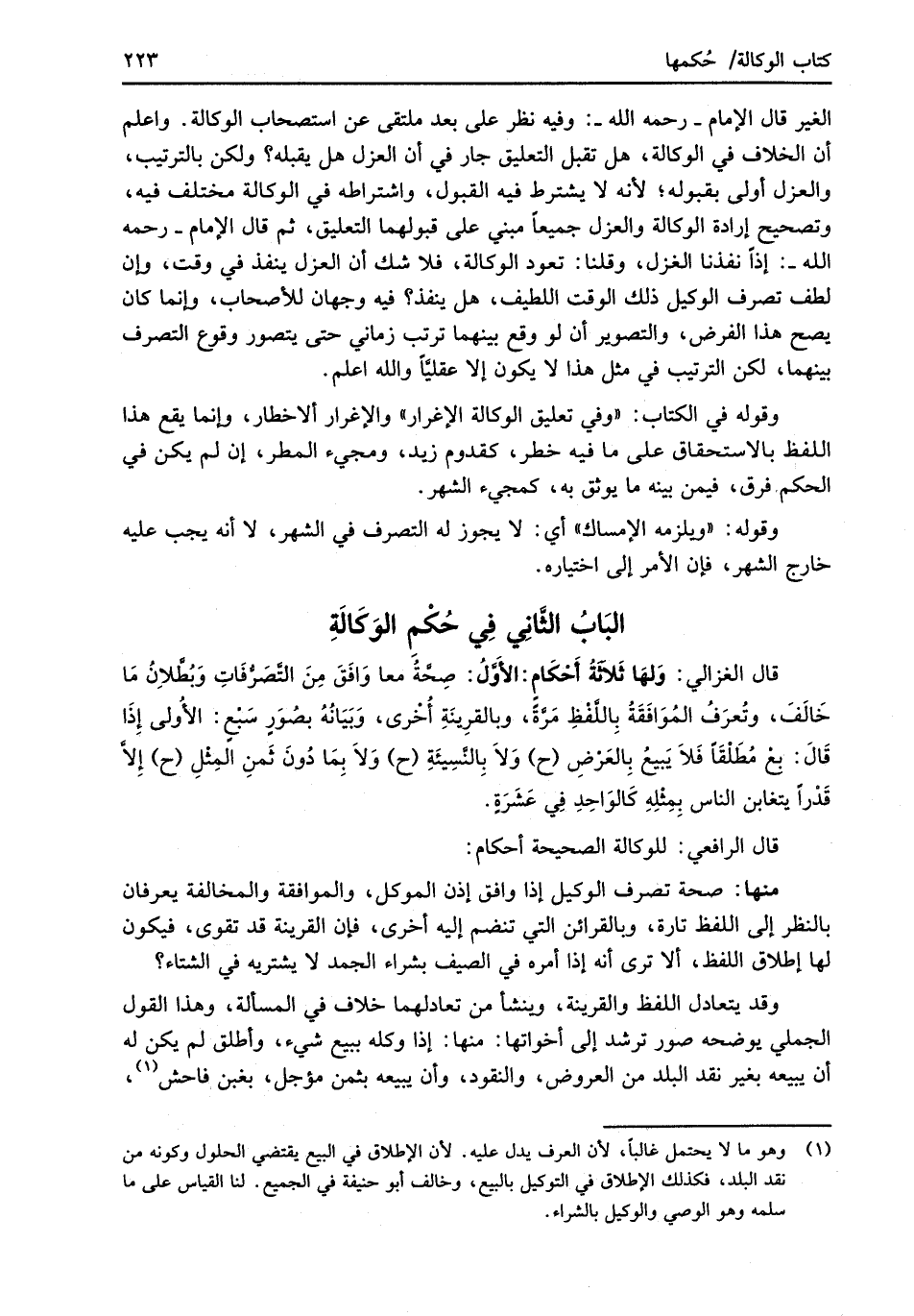الغير قال الإمام -رحمه الله-: وفيه نظر على بعد ملتقى عن استصحاب الوكالة. واعلم أن الخلاف في الوكالة، هل تقبل التعليق جار في أن العزل هل يقبله؟ ولكن بالترتيب، والعزل أولى بقبوله؛ لأنه لا يشترط فيه القبول، واشتراطه في الوكالة مختلف فيه، وتصحيح إرادة الوكالة والعزل جميعاً مبني على قبولهما التعليق، ثم قال الإمام -رحمه الله-: إذاً نفذنا الغزل، وقلنا: تعود الوكالة، فلا شك أن العزل ينفذ في وقت، وإن لطف تصرف الوكيل ذلك الوقت اللطيف، هل ينفذ؟ فيه وجهان للأصحاب، وإنما كان يصح هذا الفرض، والتصوير أن لو وقع بينهما ترتب زماني حتى يتصور وقوع التصرف بينهما، لكن الترتيب في مثل هذا لا يكون إلا عقليَّاً والله اعلم.