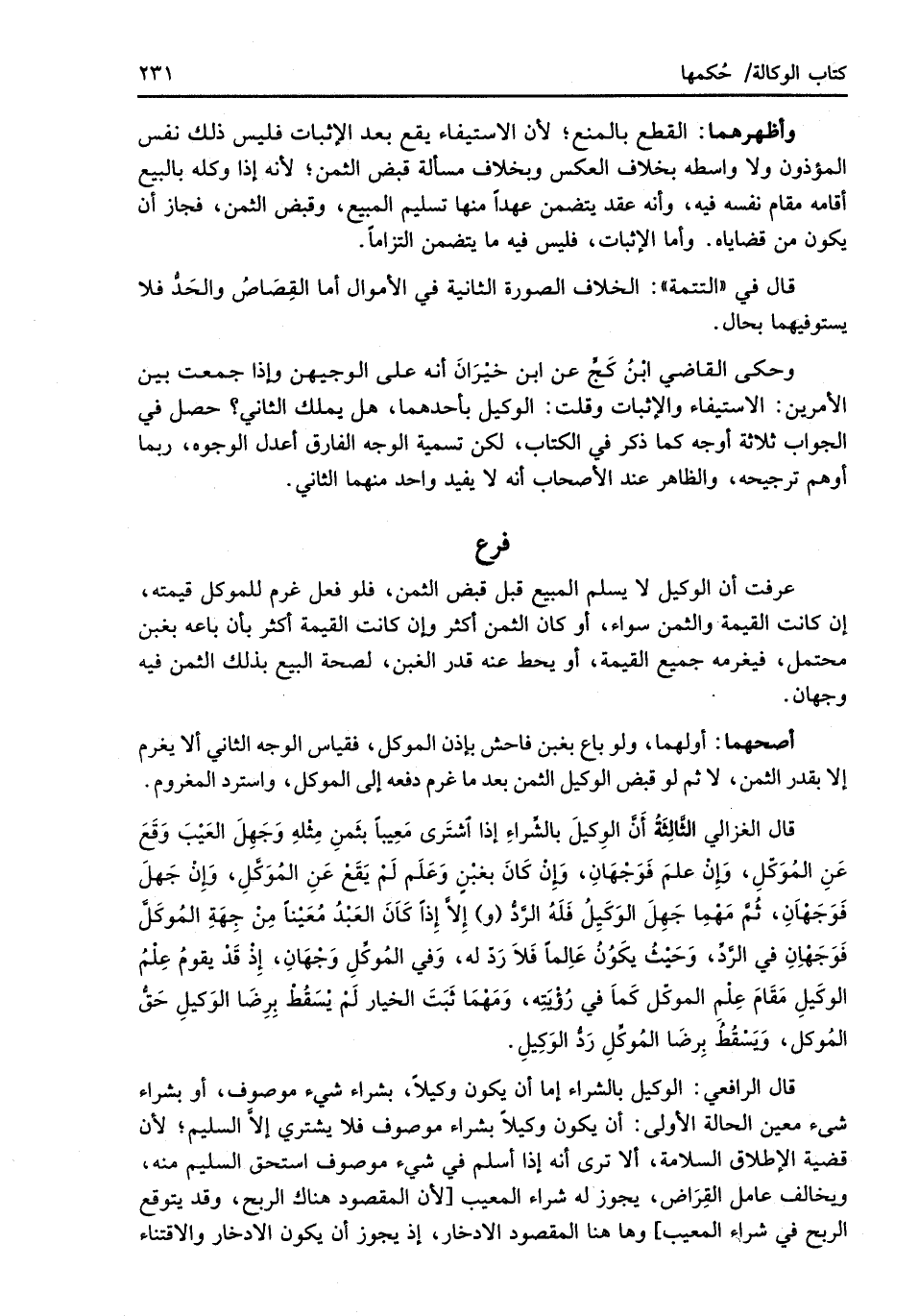 قال الغزالي الثَّالِثَةُ أَنَّ الوِكيلَ بالشِّراءِ إذا اشتَرى مَعِيباً بثَمنِ مِثْلهِ وَجَهِلَ العَيْبَ وَقَعَ عَنِ المُوَكّلِ، وَإِنْ علمَ فَوَجْهَانِ، وَإِنْ كَانَ بغبْنٍ وَعَلَم لَمْ يَقَعْ عَنِ المُوَكَّلِ، وَإِنْ جَهلَ فَوَجَهْاَنِ، ثُمَّ مَهْمِا جَهِلَ الوَكَيِلُ فَلَهُ الرَّدُّ (و) إِلاَّ إِذاَ كَاَنَ العَبْدُ مُعَيْناً مِنْ جِهَةِ المُوكَلَّ فَوَجَهْاِنِ في الرَّدِّ، وَحَيْثُ يكَوُنُ عَاِلماً فَلاَ رَدّ له، وَفي المُوكِّلِ وَجْهَانِ، إِذْ قَدْ يقومُ عِلْمُ الوكَيلِ مَقَامَ عِلْمِ الموكّل كَماَ في رُؤْيَتِه، وَمَهْمَا ثَبَتَ الخيار لَمْ يَسْقُطْ بِرِضَا الوَكيلِ حَقُّ المُوكل، وَيَسْقُطُ بِرضَا المُوكِّلِ رَدُّ الوَكِيلِ.