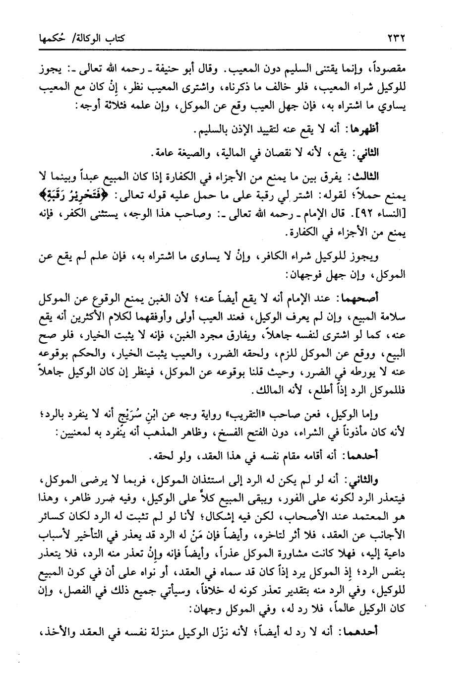 وإما الوكيل، فعن صاحب "التقريب" رواية وجه عن ابْنِ سُرَيْجٍ أنه لا ينفرد بالرد؛ لأنه كان مأذوناً في الشراء، دون الفتح الفسخ، وظاهر المذهب أنه ينفرد به لمعنيين: