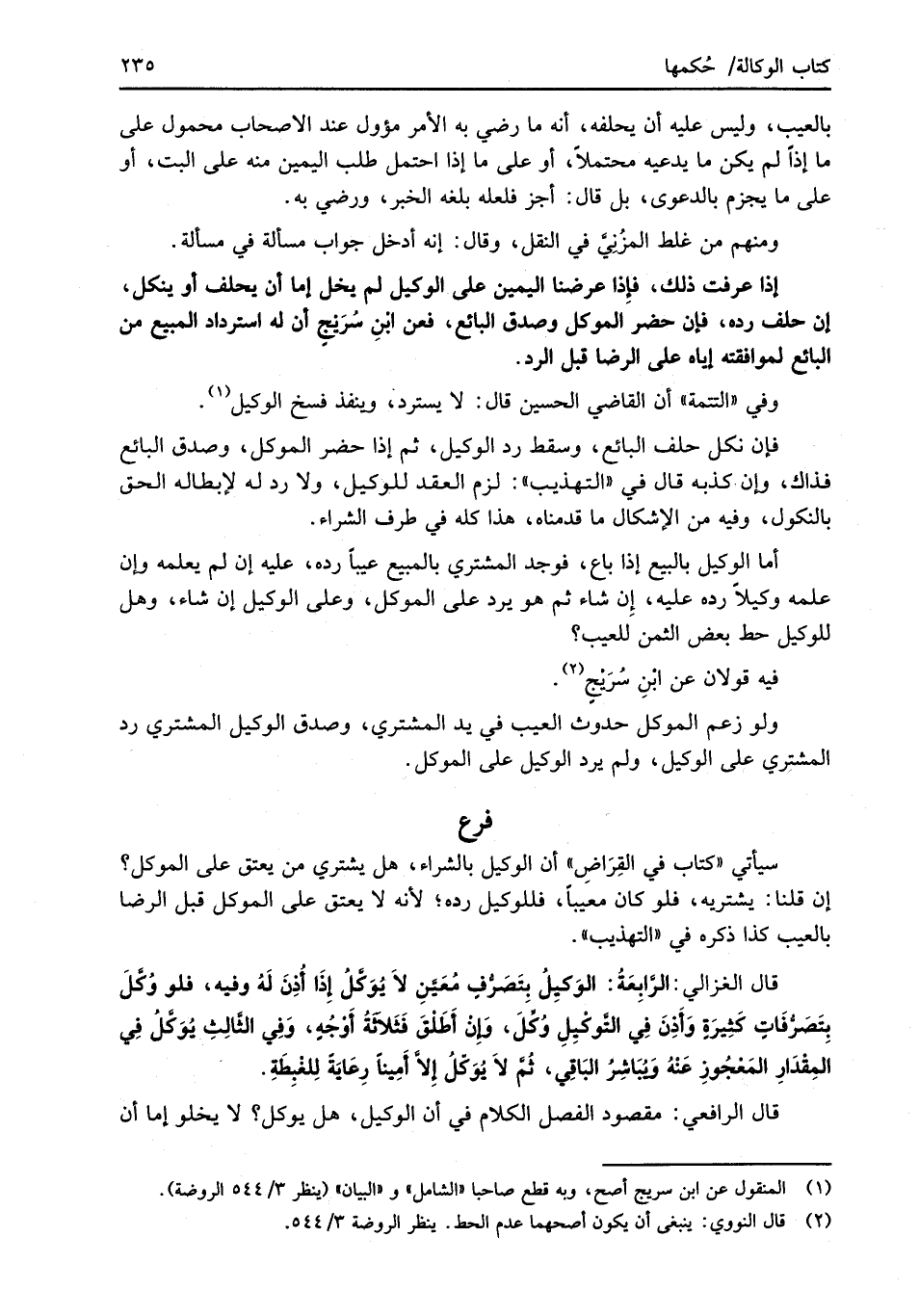 إذا عرفت ذلك، فإِذا عرضنا اليمين على الوكيل لم يخل إما أن يحلف أو ينكل، إن حلف رده، فإن حضر الموكل وصدق البائع، فعن ابنِ سُرَيْجٍ أن له استرداد المبيع من البائع لموافقته إياه على الرضا قبل الرد.