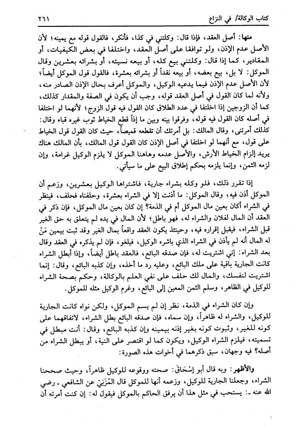 منها: أصل العقد، فهذا قال: وكلتني في كذا، فأنكر، فالقول قوله مع يمينه؛ لأن الأصل عدم الإذن، ولو توافقا على أصل العقد، واختلفا في بعض الكيفيات، أو المقادير، كما إذا قال: وكلتني بيع كله، أو بيعه نسيئه، أو بشرائه بعشرين وقال الموكل: لا بل، بيع بعضه، أو بيعه نقداً أو بشرائه بعشرة، فالقول قول الموكل أيضاً؛ لأن الأصل عدم الإذن فيما يدعيه الوكيل، والموكل أعرف بحال الإذن الصادر منه، ولأنه لما كان القول في أصل العقد قوله، وجب أن يكون في الصفة والمقدار كذلك، كما أن الزوجين إذا اخلتفا في عدد الطلاق كان القول فيه قول الزوج؛ لأنهما لو اختلفا في أصله كان القول فيه قوله، وفرقوا بينه وبين ما إذاَ قطع الخياط ثوب غيره قباء وقال: كذلك أمرتنى، وقال المالك: بل أمرتك أن تقطعه قميصاً، حيث كان القول قول الخياط على قول، مع أنهما لو اخلتفا في أصل الإذن كان القول قول المالك، بأن المالك هناك يريد إلزام الخياط الأرش، والأصل عدمه وهاهنا الموكل لا يلزم الوكيل غرامة، وإن لزمه الثمن، وإنما يلزمه بحكم إطلاق البيع على ما سيأتي.