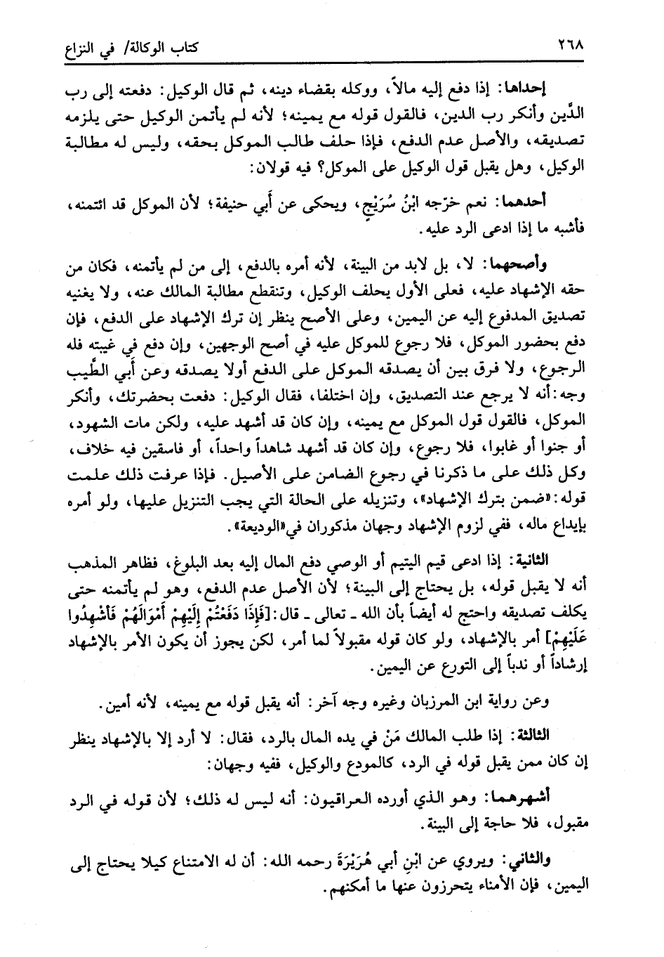 إحداها: إذا دفع إليه مالاً، ووكله بقضاء دينه، ثم قال الوكيل: دفعته إلى رب الدَّين وأنكر رب الدين، فالقول قوله مع يمينه؛ لأنه لم يأتمن الوكيل حتى يلزمه تصديقه، والأصل عدم الدفع، فإذا حلف طالب الموكل بحقه، وليس له مطالبة الوكيل، وهل يقبل قول الوكيل على الموكل؟ فيه قولان: