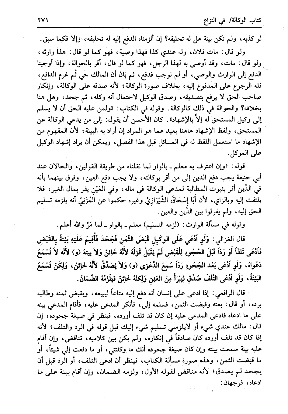قال الغزالي: وَلَوِ ادْعَي عَلَى الوكَيِلِ قَبْضَ الثَّمَنِ فَجَحَدَ فَأُقِيمَ عَلَيْهِ بَيِّنةٌ بِالقَبْضِ فَادَّعَى تَلفَاً أَوْ رَدّاً قَبْلَ الحُجُودِ لِلْقَبْضِ لَمْ يُقْبَل قَوْلُهُ لأَنَّهُ خَاِئنٌ وَلاَ بيتة (و) لأَنَّه لاَ تُسْمَعُ دَعْوَاهُ، وَلَوِ ادَّعَى بَعْد الجُحُودِ رَدّاً سُمِعَ الدَّعْوَى (و) وَلاَ يُصَدَّقُ لأَنَّهُ خَاِئنُ، وَلكَنْ تُسْمَعُ البَيِّنَةُ، وَلَوِ ادَّعَى التَّلَفَ صُدِّقِ لِيَبْرَأَ مِنَ العَيْنِ وَلكنَّهُ خَاِئنٌ فَيَلْزَمُهُ الضَّمَانُ.