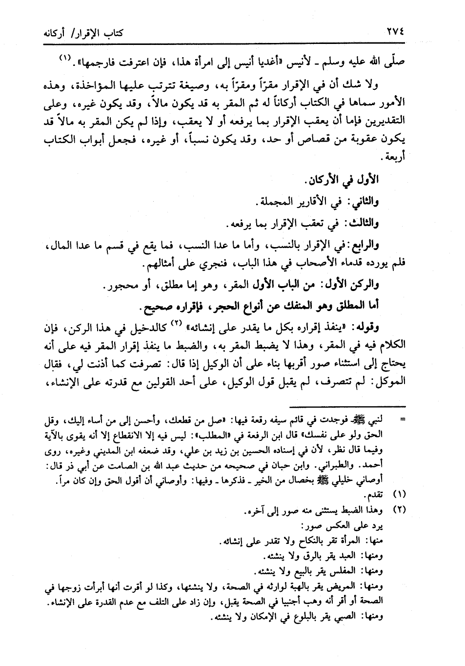 ولا شك أن في الإقرار مقرًّا ومقرًّا به، وصيغة تترتب عليها المؤاخذة، وهذه الأمور سماها في الكتاب أركانًا له ثم المقر به قد يكون مالاً، وقد يكون غيره، وعلى التقديرين فإما أن يعقب الإقرار بما يرفعه أو لا يعقب، وإذا لم يكن المقر به مالاً قد يكون عقوبة من قصاص أو حد، وقد يكون نسباً، أو غيره، فجعل أبواب الكتاب أربعة.