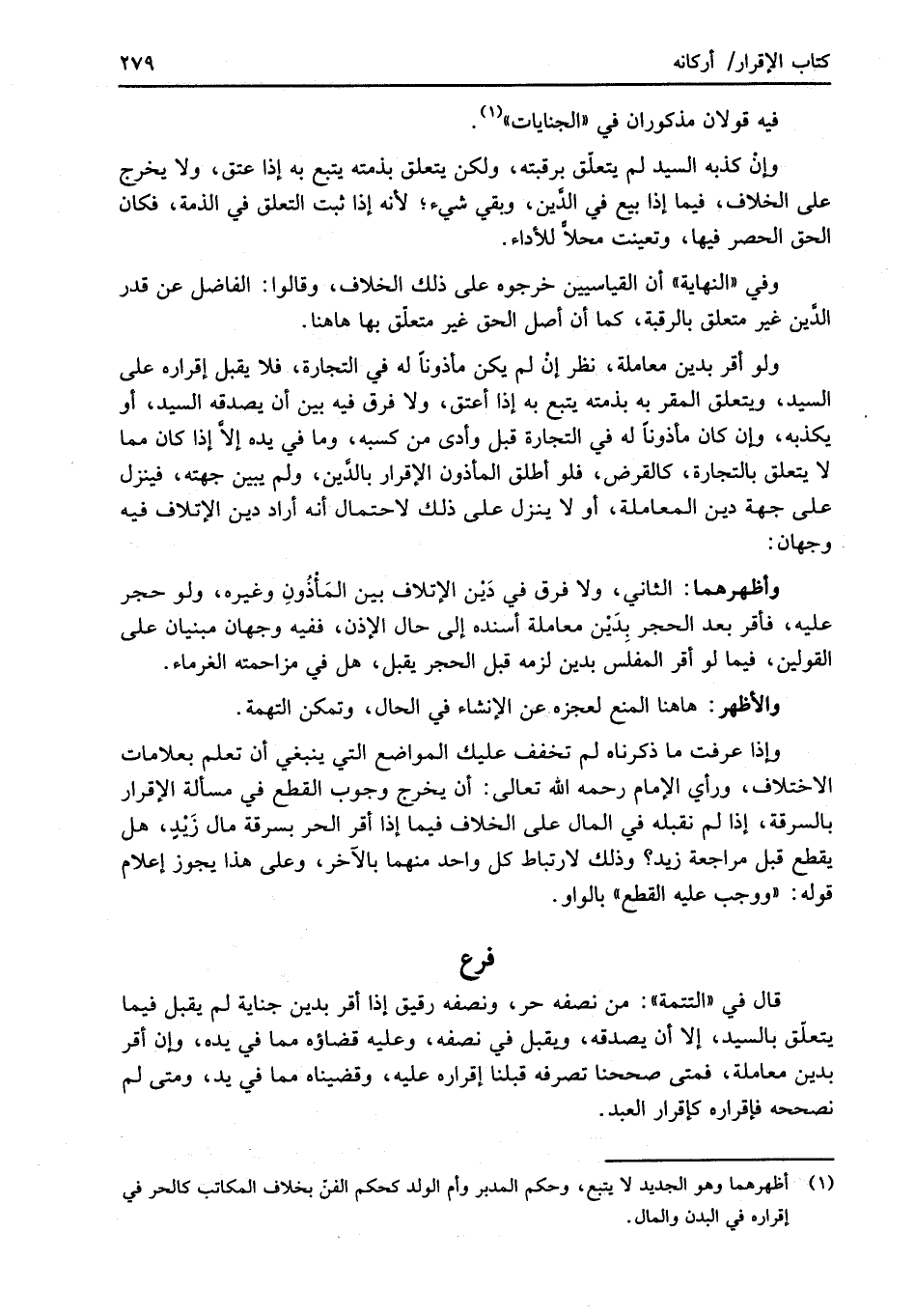 (¬1) أظهرهما وهو الجديد لا يتبع، وحكم المدبر وأم الولد كحكم الفنّ بخلاف المكاتب كالحر في إقراره في البدن والمال.