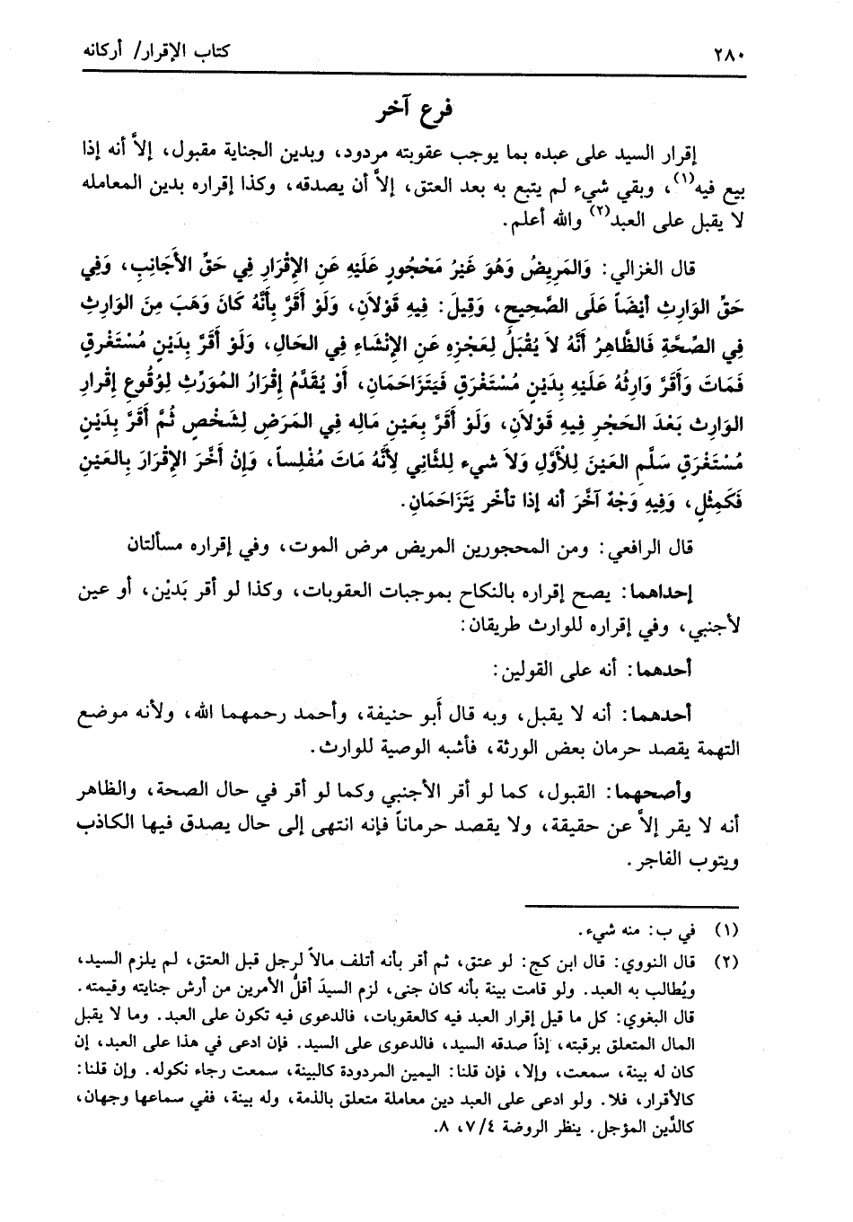 (¬2) قال النووي: قال ابن كج: لو عتق، ثم أقر بأنه أتلف مالاً لرجل قبل العتق، لم يلزم السيد، ويُطالب به العبد. ولو قامت بينة بأنه كان جنى، لزم السيدَ أقلُّ الأمرين من أرش جنايته وقيمته. قال البغوي: كل ما قيل إقرار العبد فيه كالعقوبات، فالدعوى فيه تكون على العبد. وما لا يقبل المال المتعلق برقبته، إذا صدقه السيد، فالدعوى على السيد. فإن ادعى في هذا على العبد، إن كان له بينة، سمعت، وإلا، فإن قلنا: اليمين المردودة كالبينة، سمعت رجاء نكوله. وإن قلنا: كالأقرار، فلا. ولو ادعى على العبد دين معاملة متعلق بالذمة، وله بينة، ففي سماعها وجهان، كالدَّين المؤجل. ينظر الروضة 4/ 7، 8.