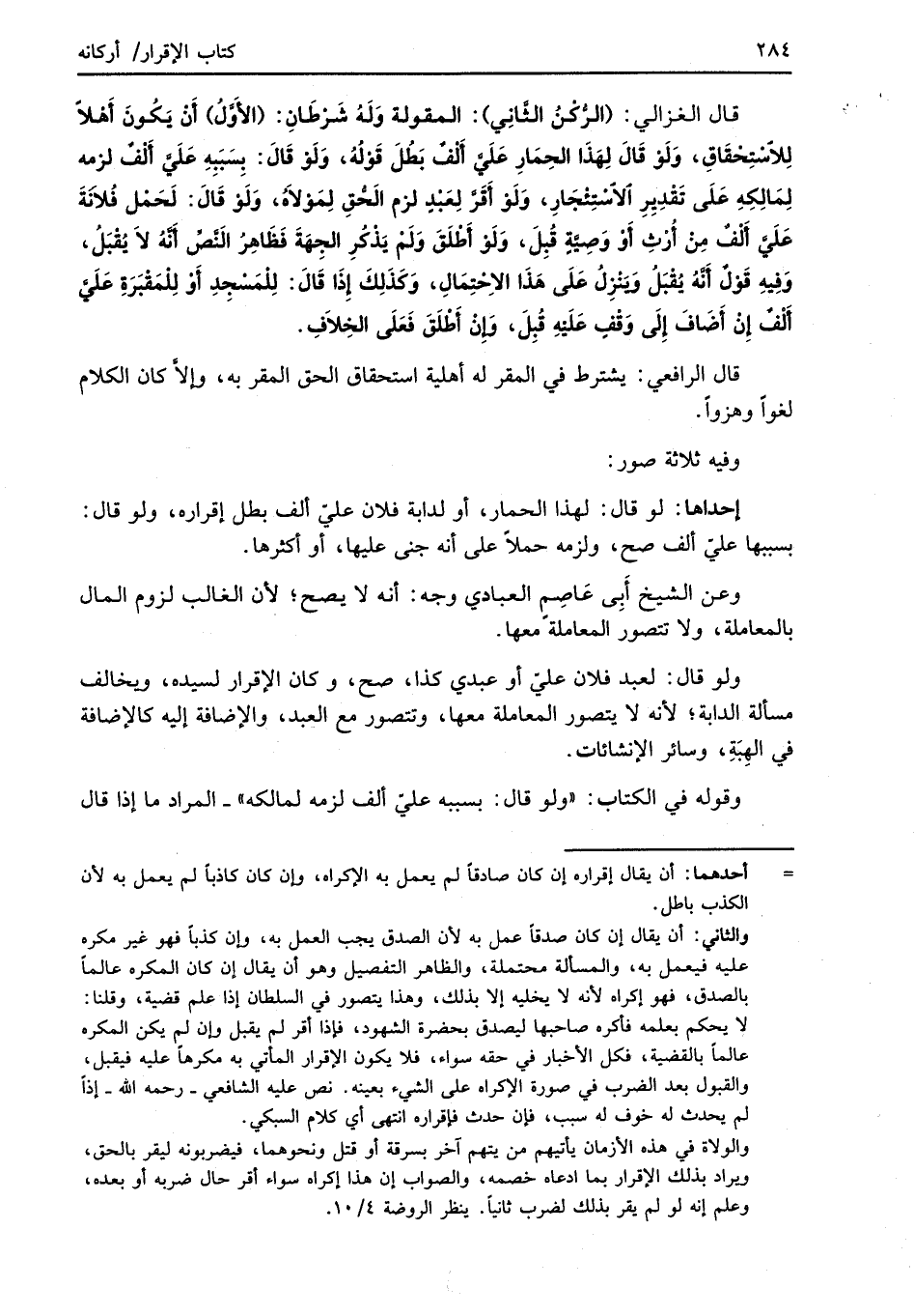 قال الغزالي: (الرُّكْنُ الثَّانِي): المقولة وَلَهُ شَرْطَانِ: (الأَوَّلُ) أَنْ يَكُونَ أَهْلاً لِلاسْتِحْقَاقِ، وَلَوْ قَالَ لِهَذَا الحِمَارِ عَلَيَّ أَلْفٌ بَطُلَ قَوْلُهُ، وَلَوْ قَالَ: بِسَبَبِهِ عَلَيَّ أَلْفٌ لزمه لِمَالِكِهِ عَلَى تَقْدِيِرِ الاسْتِئجَارِ، وَلَوْ أَقَرَّ لِعَبْدٍ لزم الَحّقِ لِمَوْلاهُ، وَلَوْ قَالَ: لَحَمْل فُلانَةَ عَلَيَّ أَلْفٌ من أُرْثِ أَوْ وَصِيَّةٍ قُبِلَ، وَلَوْ أَطْلَقَ وَلَمْ يَذْكُرِ الجِهَةَ فَظَاهِرُ الَنَّصِّ أنَّهُ لاَ يُقْبَلُ، وَفِيهِ قَوْلٌ أَنَّهُ يُقْبَلُ وَيَنْزِلُ عَلَى هَذَا الاِحْتِمَالِ، وَكَذَلِكَ إِذَا قَالَ: لِلْمَسْجِدِ أَوْ لِلْمَقْبَرَةِ عَلَيَّ أَلْفٌ إِنْ أَضَافَ إِلَى وَقْفٍ عَلَيْهِ قُبِلَ، وَإِنْ أَطْلَقَ فعَلَى الخِلاَفِ.