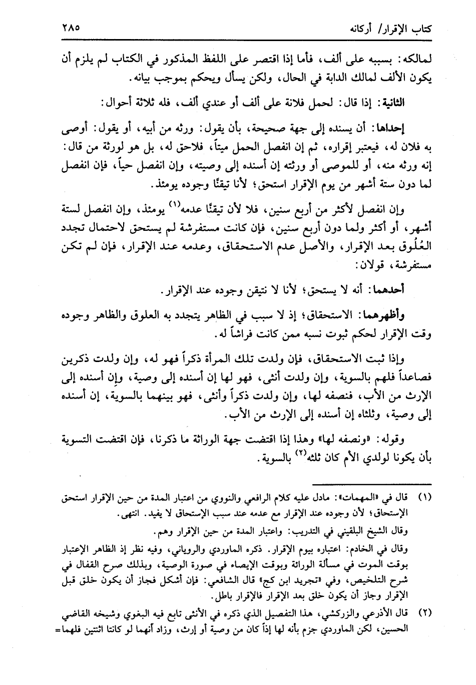 وقال في الخادم: اعتباره بيوم الإقرار. ذكره الماوردي والروياني، وفيه نظر إذ الظاهر الإعتبار بوقت الموت في مسألة الوراثة وبوقت الإيصاء في صورة الوصية، وبذلك صرح القفال في شرح التلخيص، وفي "تجريد ابن كج" قال الشَّافعي: فإن أشكل فجاز أن يكون خلق قبل الإقرار وجاز أن يكون خلق بعد الإقرار فالإقرار باطل.