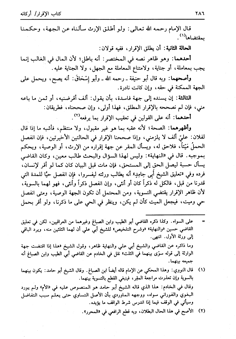 (¬1) قال النووي: وهذا المحكي عن الإمام قاله أيضاً ابن الصباغ. وقال الشيخ أبو حامد: يكون بينهما بالسوية وإن تعذرت مراجعة المقِر، فينبغي القطع بالتسوية بينهما.