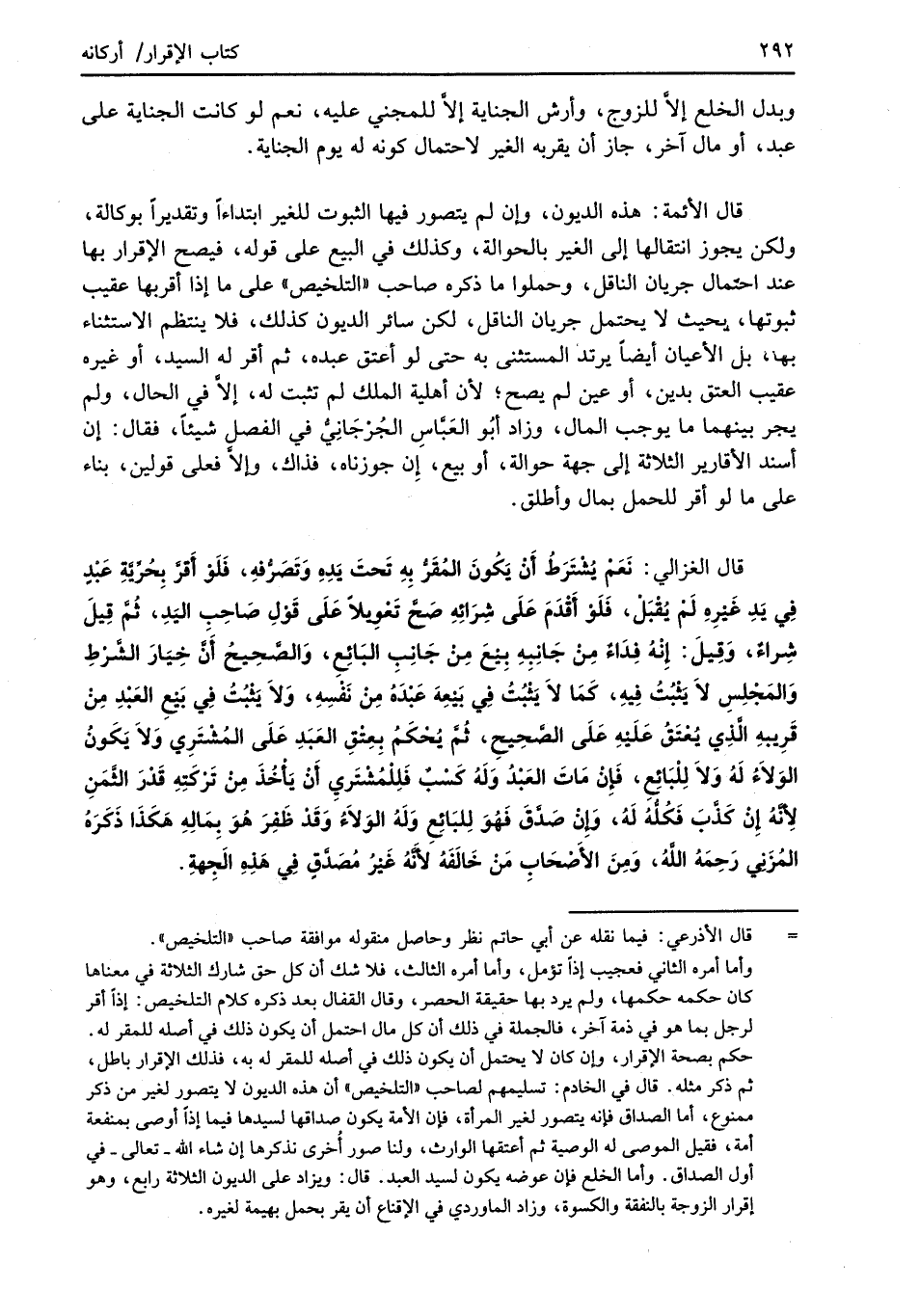 قال الغزالي: نَعَمْ يُشْتَرَطُ أَنْ يَكُونَ المُقَرُّ بِهِ تَحتَ يَدِهِ وَتَصَرُّفهِ، فَلَوْ أَقرَّ بِحُرِّيَّةِ عَبْدٍ في يَدِ غَيْرِهِ لَمْ يُقْبَلْ، فَلَوْ أَقْدَمَ عَلَى شِرَائِهِ صَحَّ تَعْوِيلاً عَلَى قَوْلِ صَاحِبِ اليَدِ، ثُمَّ قِيلَ شِراءٌ، وَقِيلَ: إِنَّهُ فِدَاءٌ مِنْ جَانِبِهِ بِيْع من جَانِبِ البَائِعِ، وَالصَّحِيحُ أَنَّ خِيَارَ الشَّرْطِ وَالمَجْلِسِ لاَ يَثْبُتُ فِيهِ، كَمَا لاَ يَثْبُتُ في بَيْعِهَ عَبْدَهُ مِنْ نَفْسِهِ، وَلاَ يَثْبُتُ في بَيْعِ العَبْدِ مِنْ قَرِيبهِ الَّذِي يُعْتَقُ عَلَيْهِ عَلَى الصَّحِيحِ، ثُمَّ يُحْكَم بِعِتْقِ العَبْدِ عَلَى المُشْتَرِي وَلاَ يَكَونُ الوَلاَءُ لَهُ وَلاَ لِلْبَائِعِ، فَإِنْ مَاتَ العَبْدُ وَلَهُ كَسْبٌ فَلِلْمشْتَريِ أَنْ يَأْخُذَ مِنْ تَرْكَتِهِ قَدْرَ الثَّمَنِ لِأنَّهُ إِنْ كَذَّبَ فَكُلُّهُ لَهُ، وَإِنْ صَدَّقَ فَهُوَ لِلبَائِعِ وَلَهُ الوَلاَءُ وَقَدْ ظَفِرَ هُوَ بِمَالِهِ هَكذَا ذَكرَهُ المُزَنِي رَحِمَهُ الله، وَمِنَ الأَصْحَابِ مَنْ خَالَفَهُ لأَنَّهُ غَيْرُ مُصَدَّقٍ في هَذهِ الَجِهةِ.