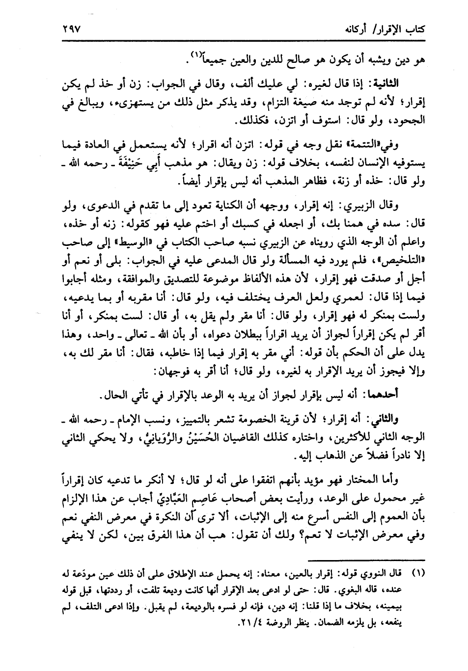 وأما المختار فهو مؤيد بأنهم اتفقوا على أنه لو قال؛ لا أنكر ما تدعيه كان إقرارًا غير محمول على الوعد، ورأيت بعض أصحاب عَاصِم العَبَّادِيِّ أجاب عن هذا الإلزام بأن العموم إلى النفس أسرع منه إلى الإثبات، ألا ترى إن النكرة في معرض النفي نعم وفي معرض الإثبات لا تعم؟ ولك أن تقول: هب أن هذا الفرق بين، لكن لا ينفي