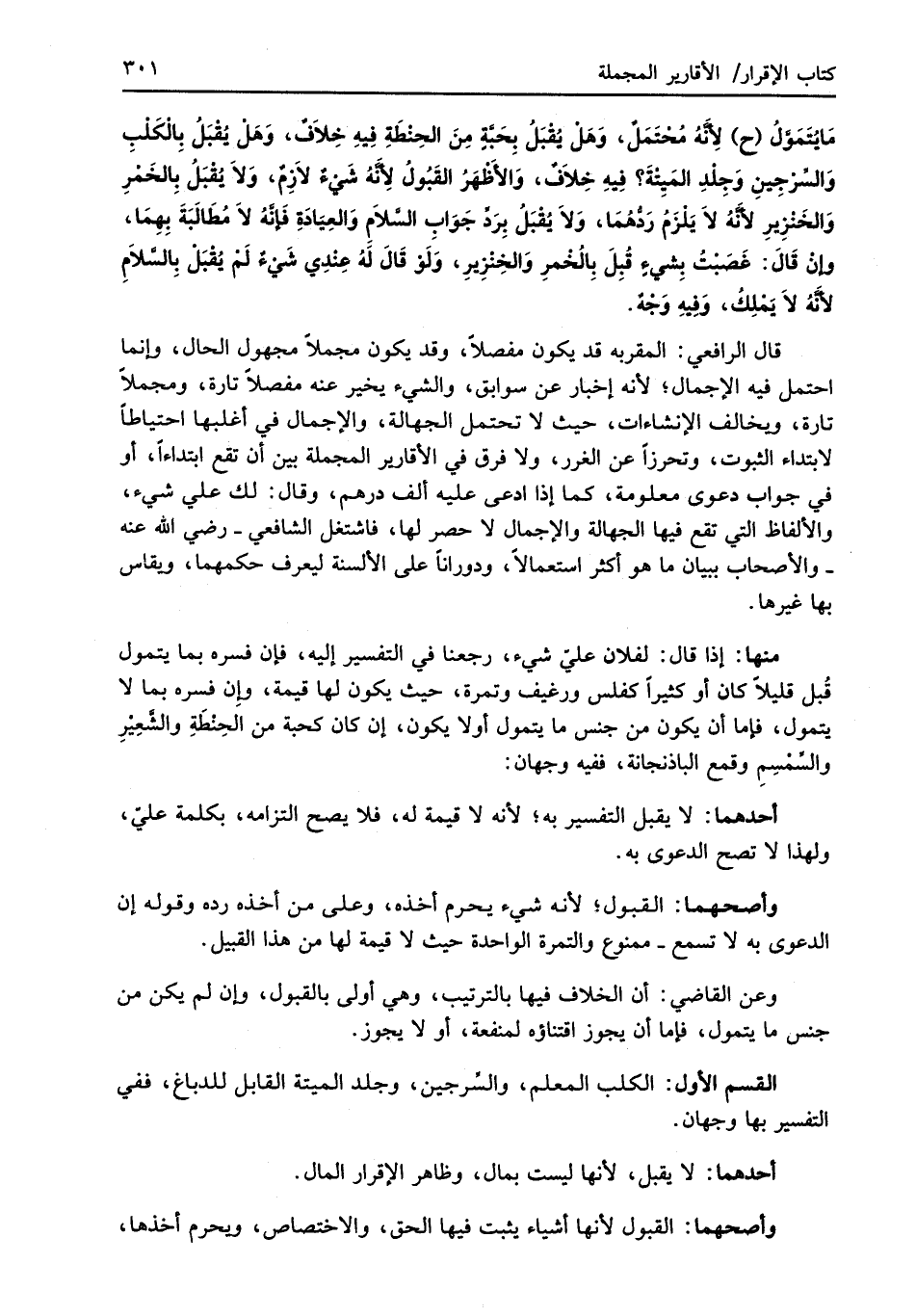 قال الرافعي: المقر به قد يكون مفصلاً، وقد يكون مجملاً مجهول الحال، وإنما احتمل فيه الإجمال؛ لأنه إخبار عن سوابق، والشيء يخير عنه مفصلاً تارة، ومجملاً تارة، ويخالف الإنشاءات، حيث لا تحتمل الجهالة، والإجمال في أغلبها احتياطًا لابتداء الثبوت، وتحرزًا عن الغرر، ولا فرق في الأقارير المجملة بين أن تقع ابتداءًا، أو في جواب دعوى معلومة، كما إذا ادعى عليه ألف درهم، وقال: لك علي شيء، والألفاظ التي تقع فيها الجهالة والإجمال لا حصر لها، فاشتغل الشَّافعي -رضي الله عنه- والأصحاب ببيان ما هو أكثر استعمالاً، ودورانًا على الألسنة ليعرف حكمهما، ويقاس بها غيرها.