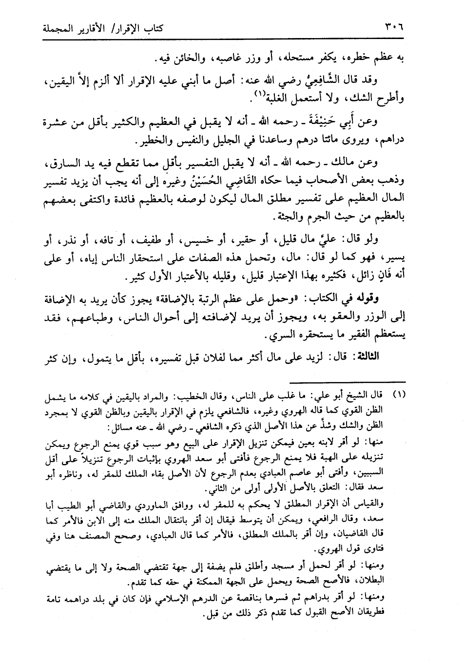 وعن مالك -رحمه الله- أنه لا يقبل التفسير بأقل مما تقطع فيه يد السارق، وذهب بعض الأصحاب فيما حكاه القَاضِي الحُسَيْنُ وغيره إلى أنه يجب أن يزيد تفسير المال العظيم على تفسير مطلق المال ليكون لوصفه بالعظيم فائدة واكتفى بعضهم بالعظيم من حيث الجرم والجثة.