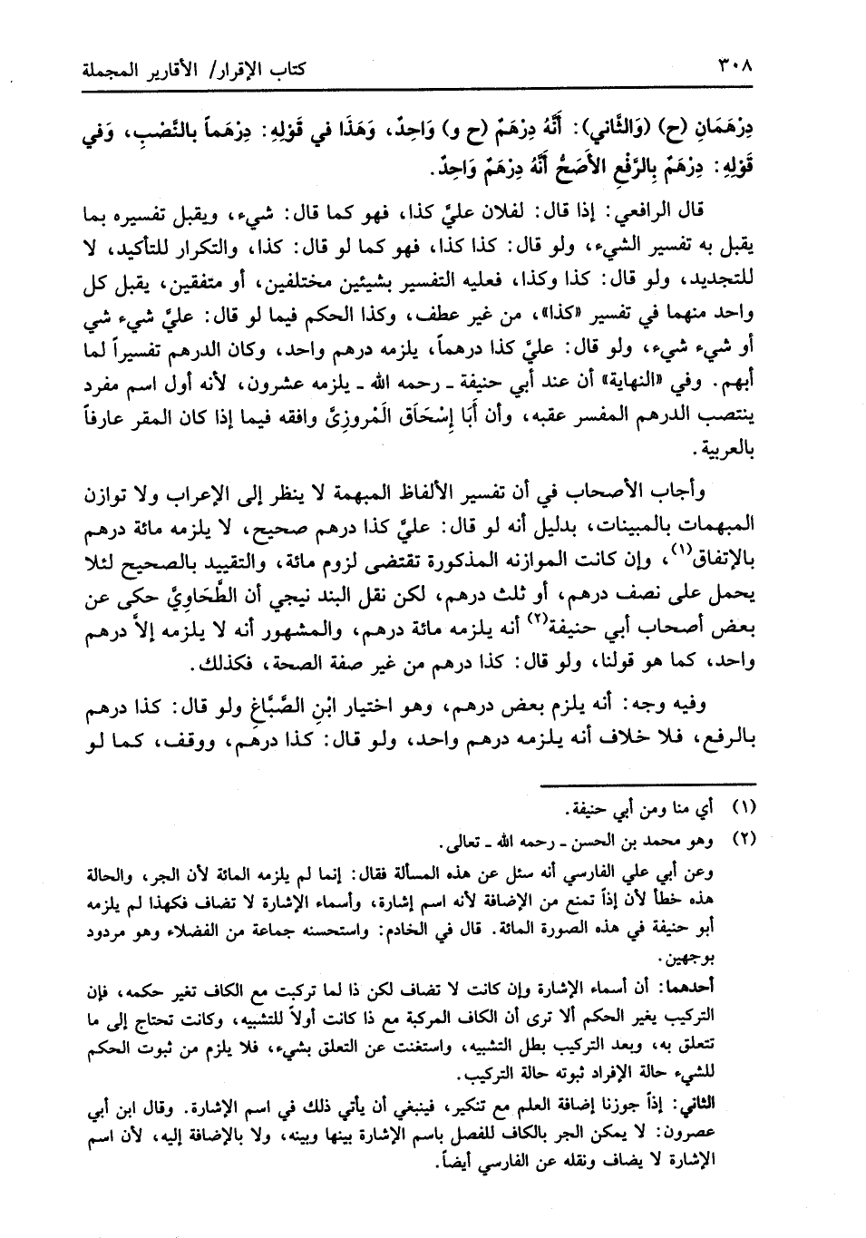 وأجاب الأصحاب في أن تفسير الألفاظ المبهمة لا ينظر إلى الإعراب ولا توازن المبهمات بالمبينات، بدليل أنه لو قال: عليَّ كذا درهم صحيح، لا يلزمه مائة درهم بالإتفاق (¬1)، وإن كانت الموازنه المذكورة تقتضى لزوم مائة، والتقييد بالصحيح لئلا يحمل على نصف درهم، أو ثلث درهم، لكن نقل البندنيجي أن الطَّحَاوِيَّ حكى عن بعض أصحاب أبي حنيفة (¬2) أنه يلزمه مائة درهم، والمشهور أنه لا يلزمه إلاَّ درهم واحد، كما هو قولنا، ولو قال: كذا درهم من غير صفة الصحة، فكذلك.