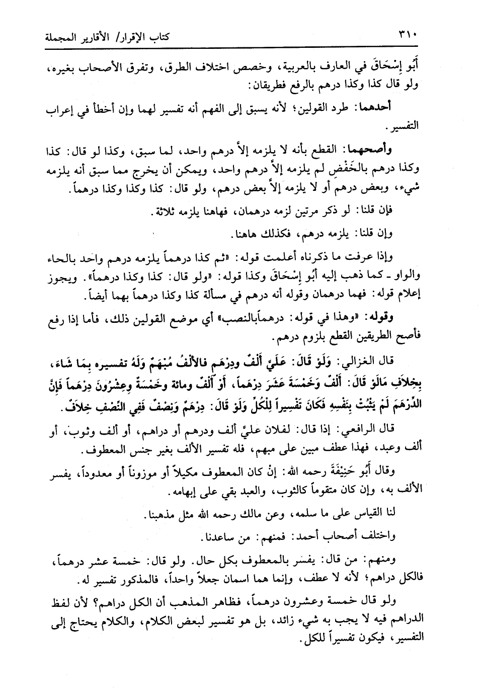 أَبُو إِسْحَاقَ في العارف بالعربية، وخصص اختلاف الطرق، وتفرق الأصحاب بغيره، ولو قال كذا وكذا درهم بالرفع فطريقان: