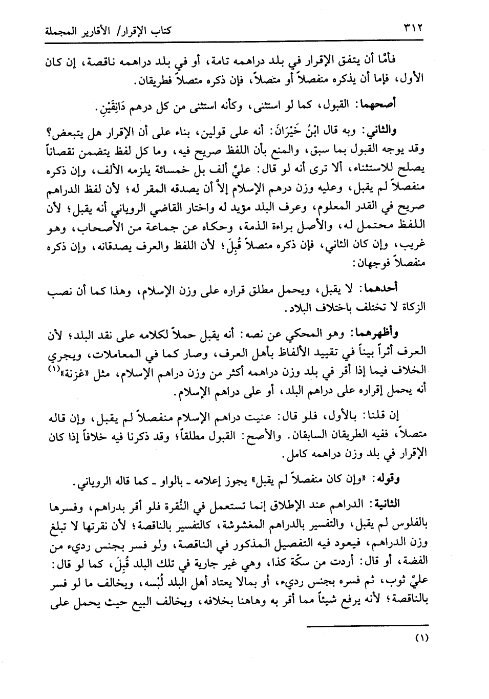 فأمَّا أن يتفق الإقرار في بلد دراهمه تامة، أو في بلد دراهمه ناقصة، إن كان الأول، فإما أن يذكره منفصلاً أو متصلاً، فإن ذكره متصلاً فطريقان.