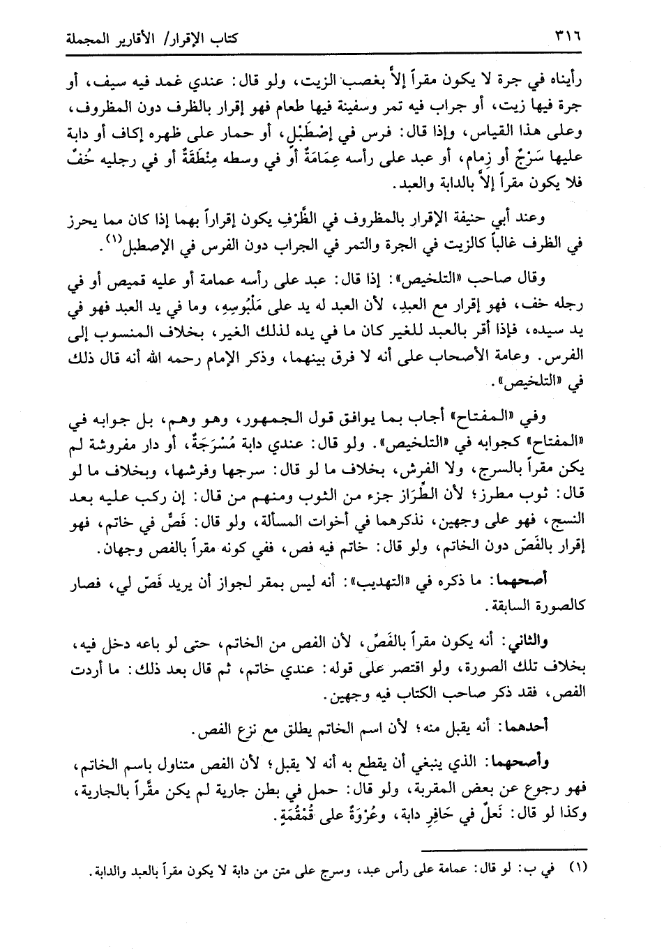 رأيناه في جرة لا يكون مقرًا إلاَّ بغصب الزيت، ولو قال: عندي غمد فيه سيف، أو جرة فيها زيت، أو جراب فيه تمر وسفينة فيها طعام فهو إقرار بالظرف دون المظروف، وعلى هذا القياس، وإذا قال: فرس في إصْطَبْلٍ، أو حمار على ظهره إكاف أو دابة عليها سَرْجٌ أو زِمام، أو عبد على رأسه عِمَامَةٌ أو في وسطه مِنْطَقَةٌ أو في رجليه خُفٌ فلا يكون مقرًا إلاَّ بالدابة والعبد.
