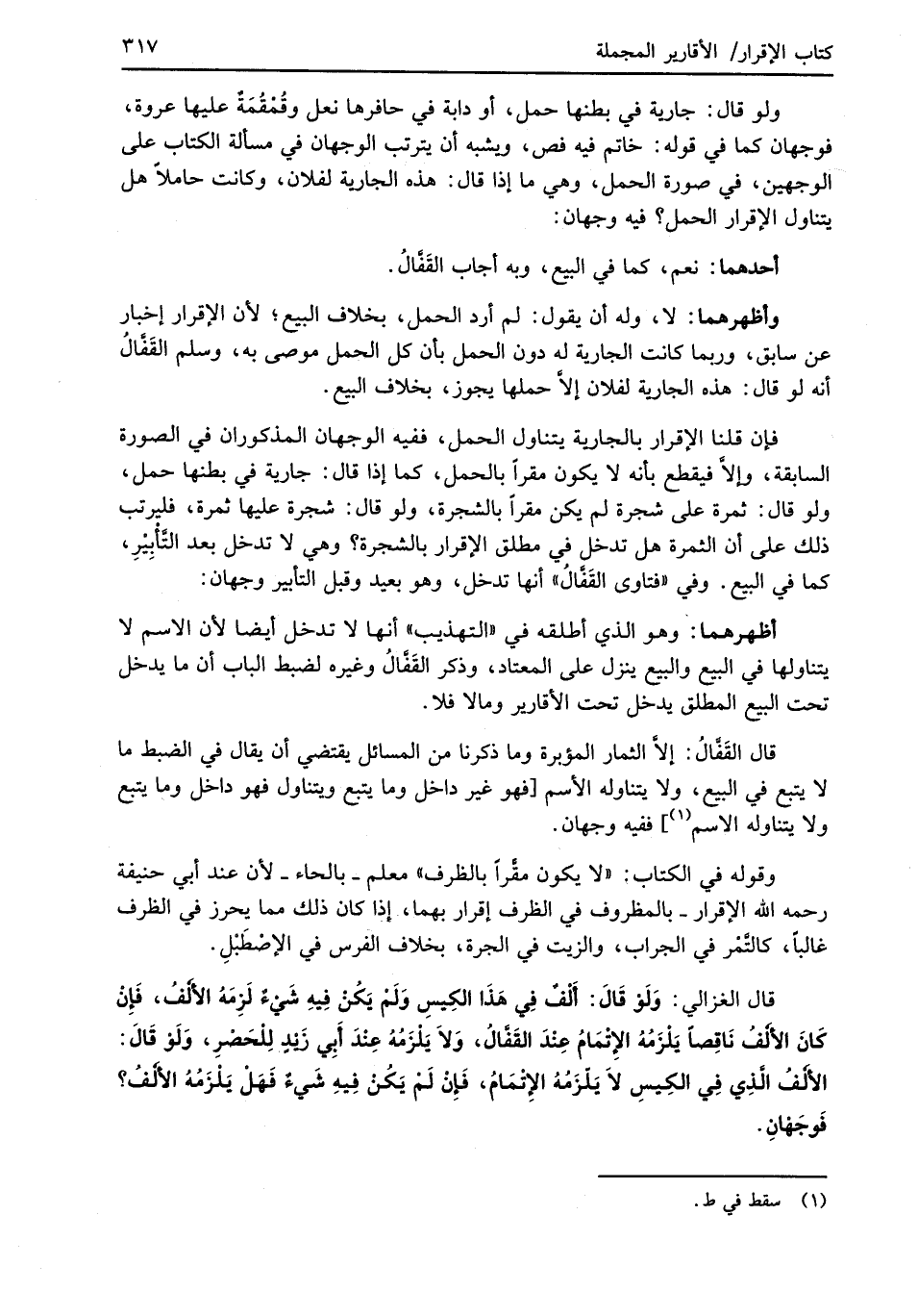 قال الغزالي: وَلَوْ قَالَ: أَلْفٌ في هَذَا الكِيسِ وَلَمْ يَكُنْ فِيهِ شَيْءٌ لَزِمَهُ الأَلْفُ، فَإِنْ كَانَ الأَلْفُ نَاقِصًا يَلْزَمُهُ الإِتْمَامُ عِنْدَ القَفَّالُ، وَلا يَلْزَمُهُ عِنْدَ أَبِي زَيْدٍ لِلْحَصْرِ، وَلَوْ قَالَ: الأَلْفُ الَّذِي في الكِيسِ لاَ يَلْزَمُهُ الإِتْمَامُ، فَإِنْ لَمْ يَكُن فِيهِ شَيءٌ فَهَلْ يَلْزَمُهُ الأَلْفُ؟ فَوجْهَانِ.