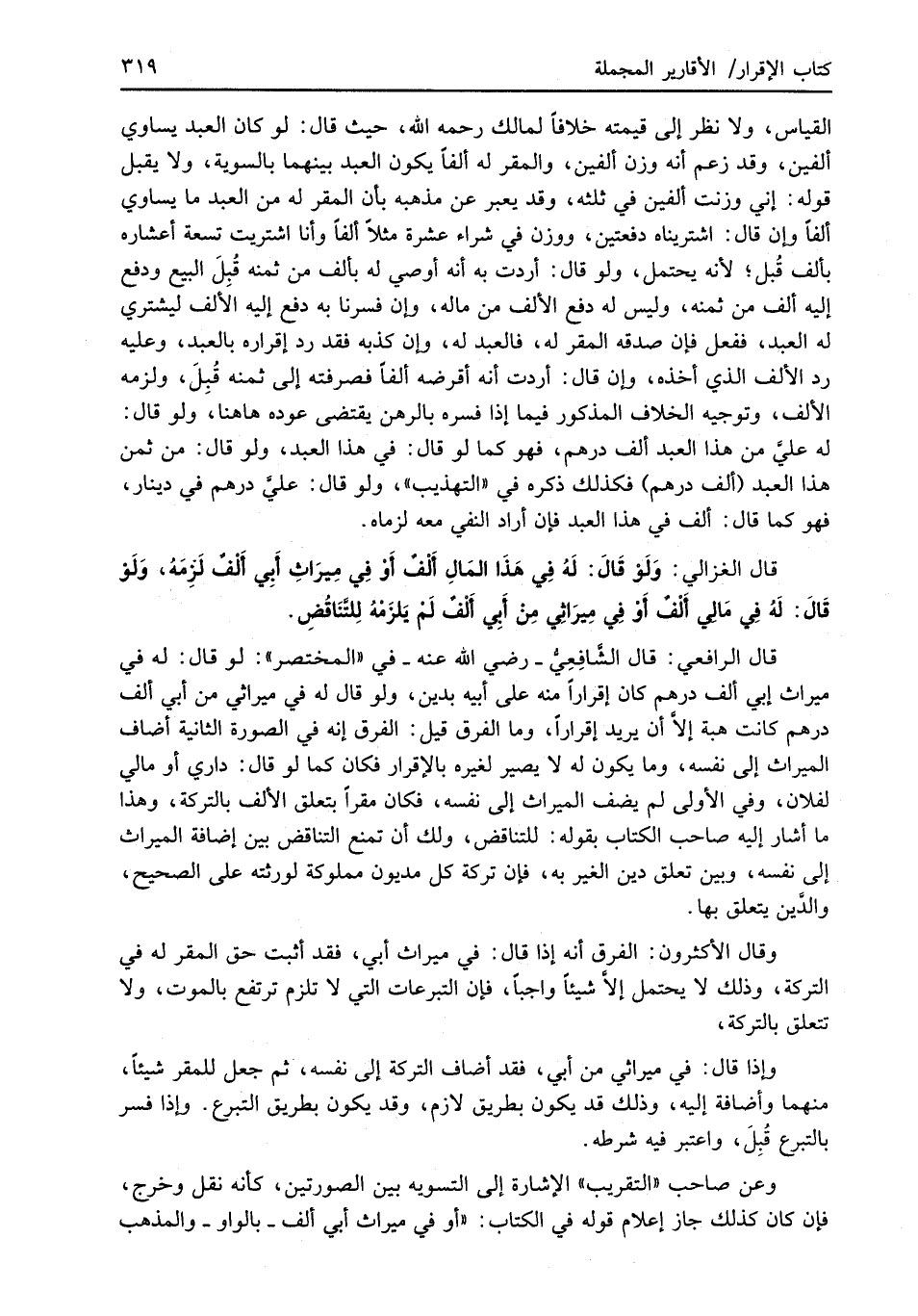 وعن صاحب "التقريب" الإشارة إلى التسويه بين الصورتين، كأنه نقل وخرج، فإن كان كذلك جاز إعلام قوله في الكتاب: "أو في ميراث أبي ألف -بالواو- والمذهب