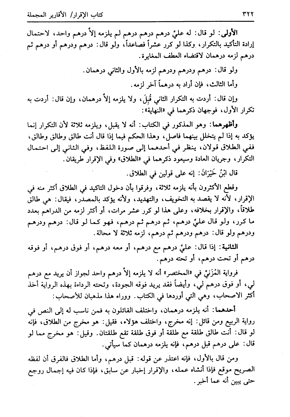 وقطع الأكثرون بأنه يلزمه ثلاثة، وفرقوا بأن دخول التأكيد في الطلاق أكثر منه في الإقرار؛ لأنه لا يقصد به التخويف، والتهديد، ولأنه يؤكد بالمصدر، فيقال: هي طالق طلاقًا، والإقرار بخلافه، وعلى هذا لو كرر عشر مرات، أو أكثر لزمه من الدراهم بعدد ما كرر، ولو قال عليَّ درهم، ثم درهم ثم درهم، فهو كما لو قال: درهم ودرهم ودرهم ولو قال: درهم ودرهم ثم درهم، لزمه ثلاثة لا محالة.