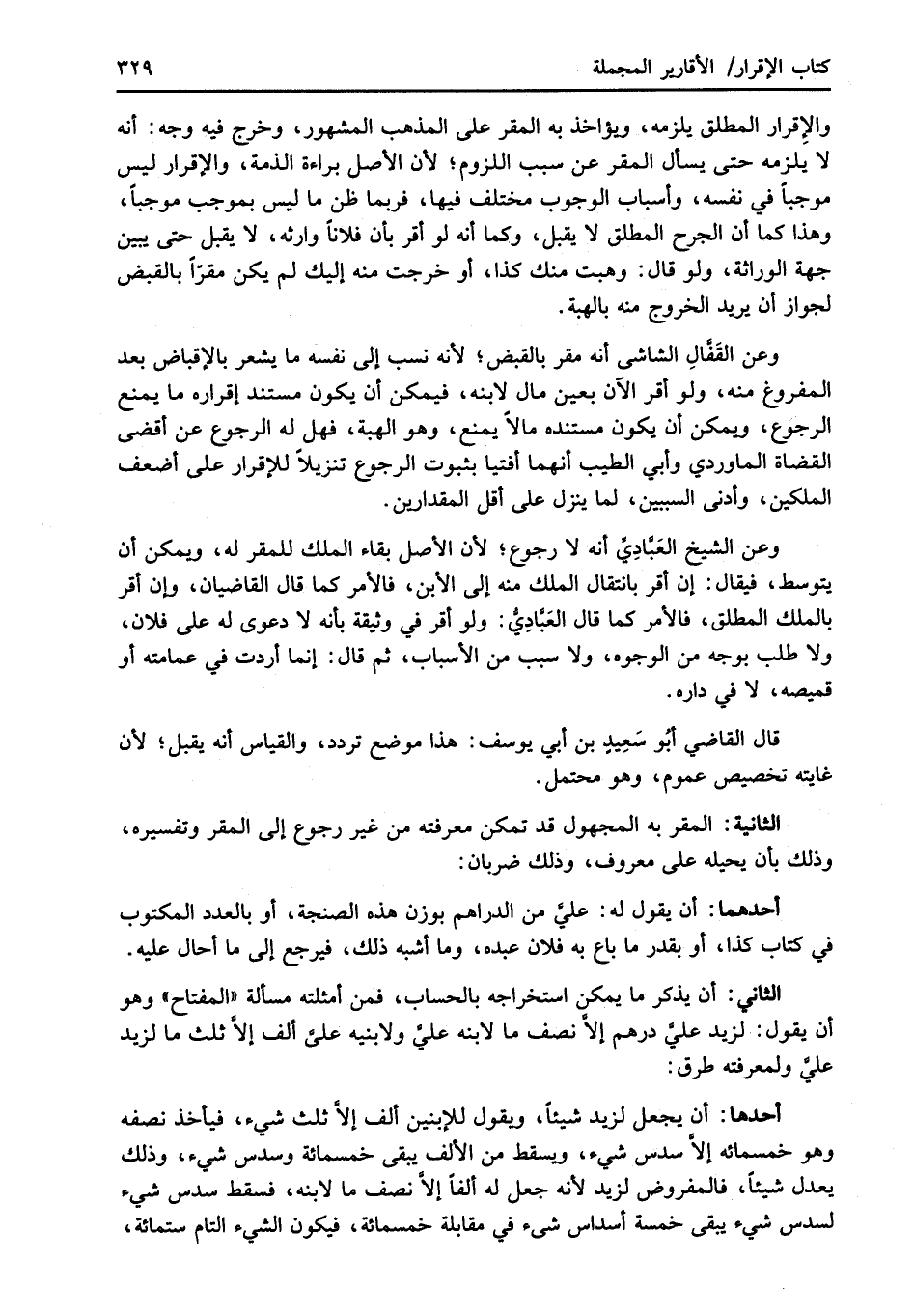 الثاني: أن يذكر ما يمكن استخراجه بالحساب، فمن أمثلته مسالة "المفتاح" وهو أن يقول: لزيد عليَّ درهم إلاَّ نصف ما لابنه عليَّ ولابنيه عليَّ ألف إلاَّ ثلث ما لزيد عليَّ ولمعرفته طرق: