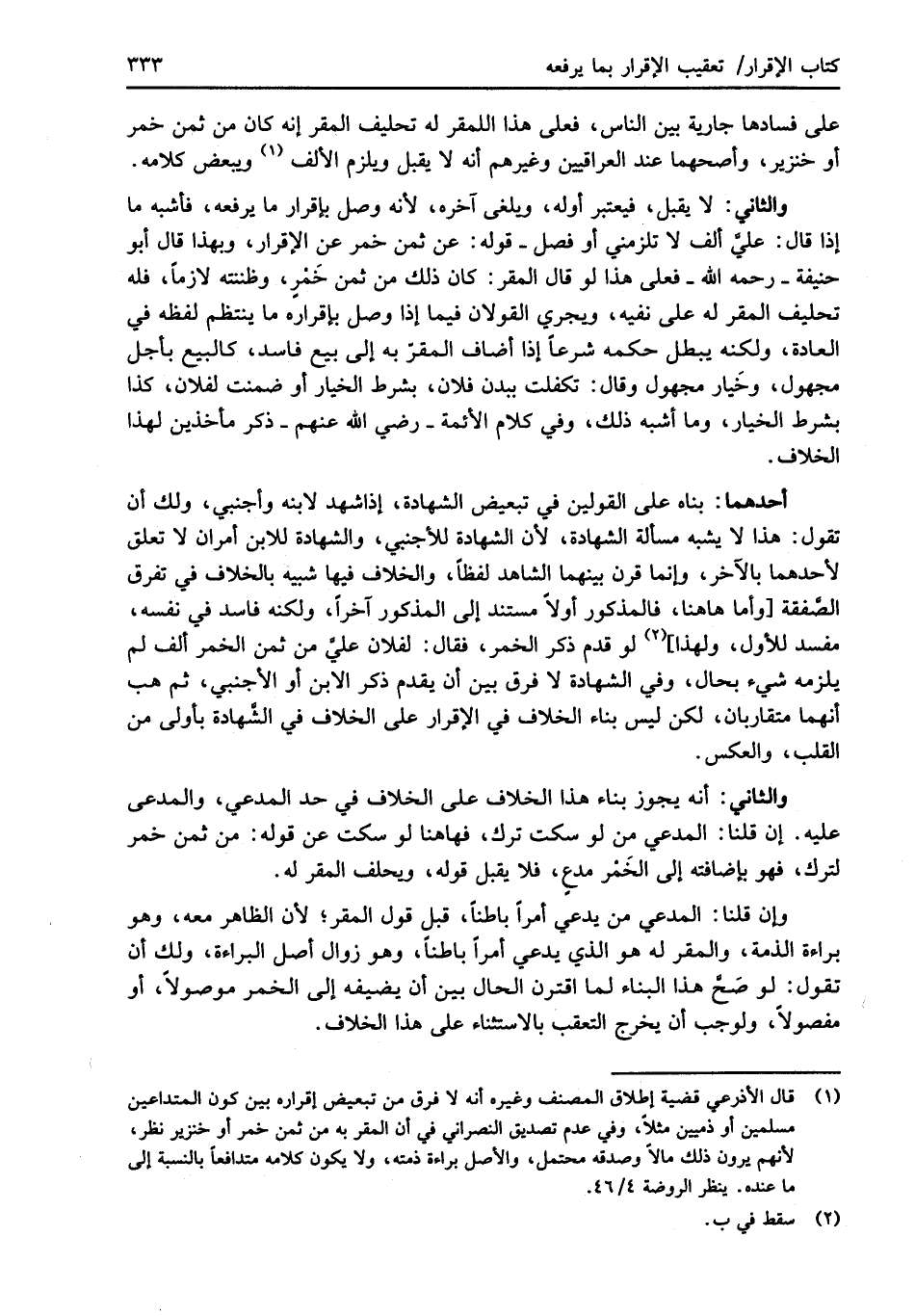 أحدهما: بناه على القولين في تبعيض الشهادة، إذا شهد لابنه وأجنبي، ولك أن تقول: هذا لا يشبه مسألة الشهادة، لأن الشهادة للأجنبي، والشهادة للابن أمران لا تعلق لأحدهما بالآخر، وإنما قرن بينهما الشاهد لفظًا، والخلاف فيها شبيه بالخلاف في تفرق الصَّفقة [وأما هاهنا، فالمذكور أولاً مستند إلى المذكور آخرًا، ولكنه فاسد في نفسه، مفسد للأول، ولهذا] (¬2) لو قدم ذكر الخمر، فقال: لفلان عليَّ من ثمن الخمر ألف لم يلزمه شيء بحال، وفي الشهادة لا فرق بين أن يقدم ذكر الابن أو الأجنبي، ثم هب أنهما متقاربان، لكن ليس بناء الخلاف في الإقرار على الخلاف في الشَّهادة بأولى من القلب، والعكس.