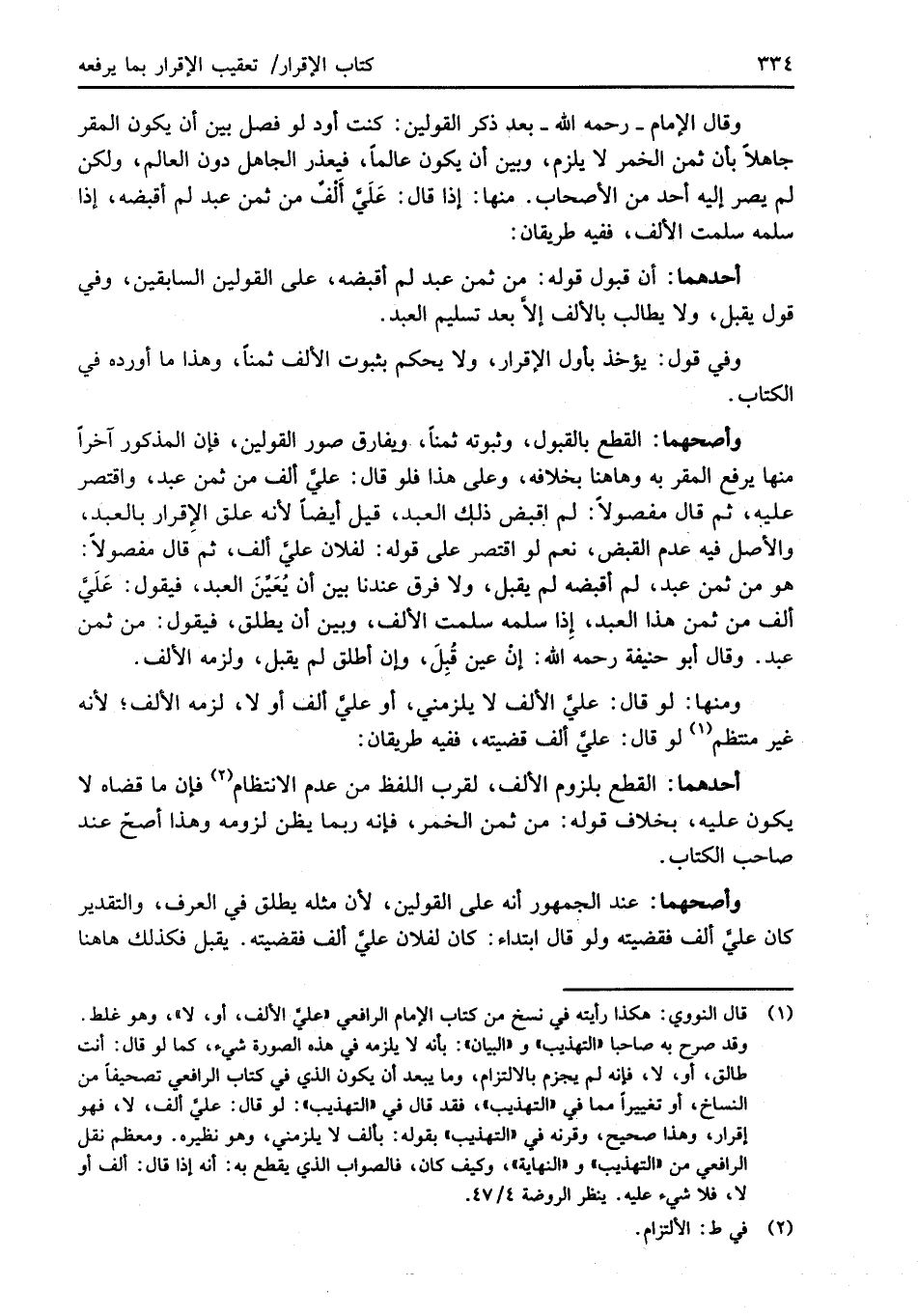 وقال الإمام -رحمه الله- بعد ذكر القولين: كنت أود لو فصل بين أن يكون المقر جاهلاً بأن ثمن الخمر لا يلزم، وبين أن يكون عالمًا، فيعذر الجاهل دون العالم، ولكن لم يصر إليه أحد من الأصحاب. منها: إذا قال: عَلَيَّ أَلْفٌ من ثمن عبد لم أقبضه، إذا سلمه سلمت الألف، ففيه طريقان:
