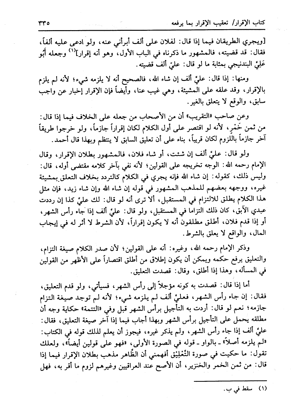 ومنها: إذا قال: عليَّ ألف إن شاء الله، فالصحيح أنه لا يلزمه شيء؛ لأنه لم يلزم بالإقرار، وقد علقه على المشيئة، وهي غيب عنا، وأيضًا فإن الإقرار إخبار عن واجب سابق، والوقع لا يتعلق بالغير.