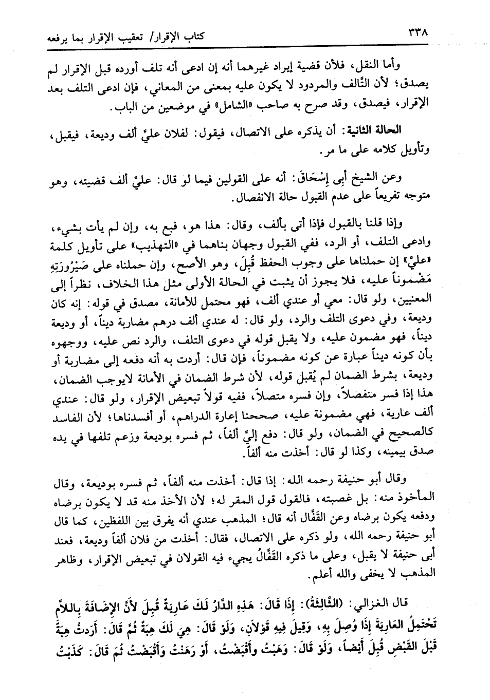 قال الغزالي: (الثَّالِثَةُ): إِذَا قَالَ: هَذِهِ الدَّارُ لَكَ عَارَيةٌ قُبِلَ لأَنَّ الإِضَافَةَ بِاللاَّمِ تَحْتَمِلُ العَارِيَةَ إِذَا وُصِلَ بِهِ، وَقِيلَ فِيهِ قَوْلانِ، وَلَوْ قَالَ: هِيَ لَكَ هِبَةٌ ثُمَّ قَالَ: أَرَدتُّ هِبَةً قَبْلَ القَبْضِ قُبِلَ أَيْضًا، وَلَوْ قَالَ: وَهَبْتُ وأَقْبَضْتُ، أَوْ رَهَنْتُ وَأَقْبَضْتُ ثُمَ قَالَ: كَذَبْتُ