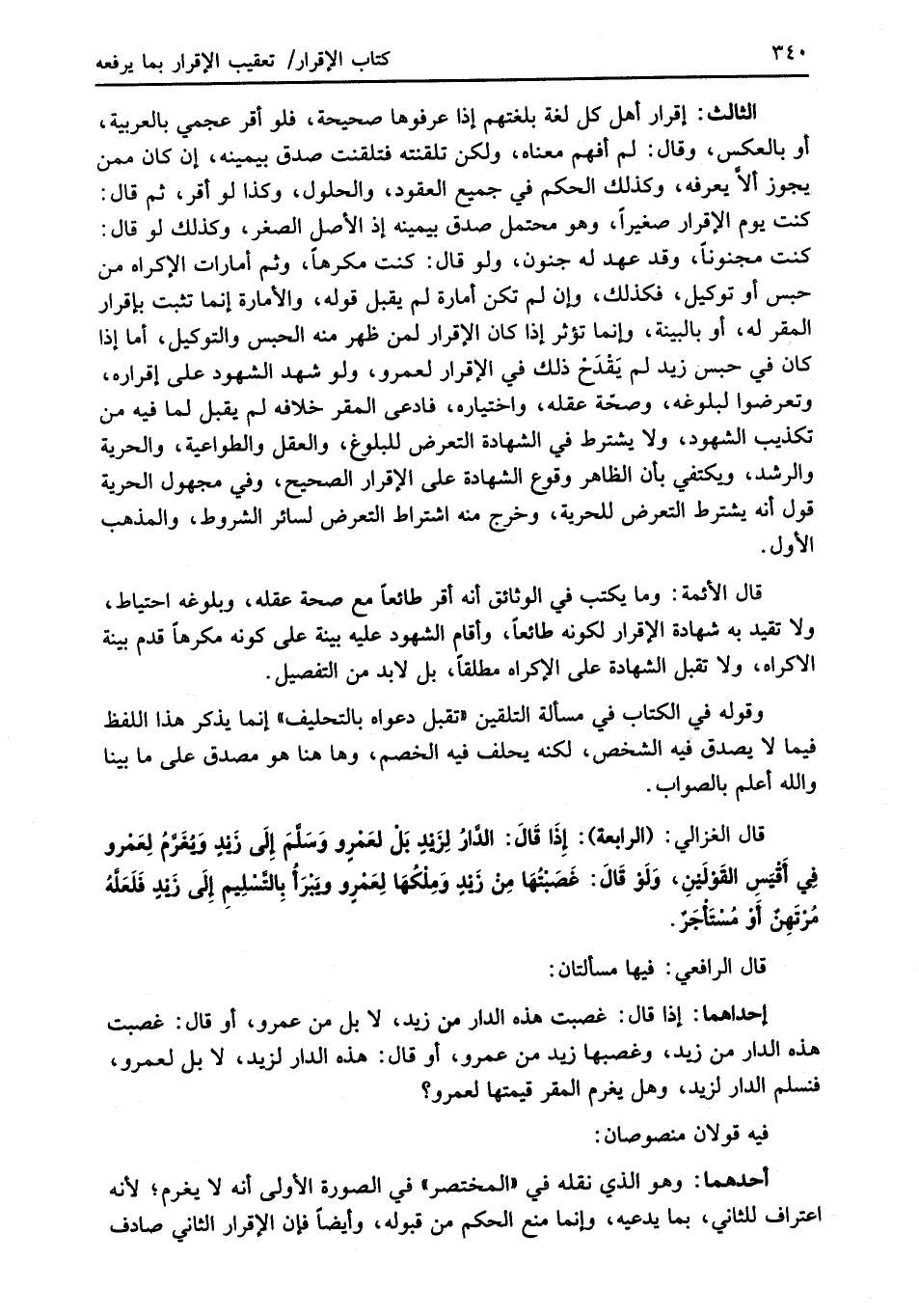 الثالث: إقرار أهل كل لغة بلغتهم إذا عرفوها صحيحة، فلو أقر عجمي بالعربية، أو بالعكس، وقال: لم أفهم معناه، ولكن تلقنته فتلقنت صدق بيمينه، إن كان ممن يجوز إلاَّ يعرفه، وكذلك الحكم في جميع العقود، والحلول، وكذا لو أقر، ثم قال: كنت يوم الإقرار صغيرًا، وهو محتمل صدق بيمينه إذ الأصل الصغر، وكذلك لو قال: كنت مجنونًا، وقد عهد له جنون، ولو قال: كنت مكرهًا، وثم أمارات الإكراه من حبس أو توكيل، فكذلك، وإن لم تكن أمارة لم يقبل قوله، والأمارة إنما تثبت بإقرار المقر له، أو بالبينة، وإنما تؤثر إذا كان الإقرار لمن ظهر منه الحبس والتوكيل، أما إذا كان في حبس زيد لم يَقْدَحْ ذلك في الإقرار لعمرو، ولو شهد الشهود على إقراره، وتعرضوا لبلوغه، وصحّة عقله، واختياره، فادعى المقر خلافه لم يقبل لما فيه من تكذيب الشهود، ولا يشنرط في الشهادة التعرض للبلوغ، والعقل والطواعية، والحرية والرشد، ويكتفي بأن الظاهر وقوع الشهادة على الإقرار الصحيح، وفي مجهول الحرية قول أنه يشترط التعرض للحرية، وخرج منه اشتراط التعرض لسائر الشروط، والمذهب الأول.
