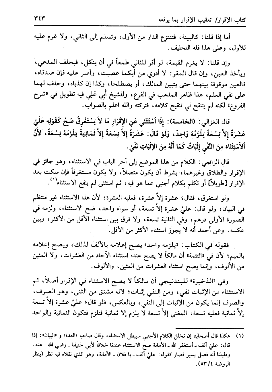 قال الغزالي: (الخامسة): إِذَا اسْتَثنَي عَنِ الإِقْرَارِ مَا لاَ يَسْتَغرِقُ صَحَّ كَقَوْلهِ عَلَيَّ عَشَرَةٌ إِلاَّ تِسْعَةً يَلْزَمُهُ وَاحِدٌ، وَلَوْ قَالَ: عَشَرَةٌ إِلاَّ تِسْعَةً إِلاَّ ثَمَانِيَةً يَلْزَمَهُ تِسْعَةٌ، لأَنَّ الاسْتِثْنَاءَ مِنَ النَّفْيِ إِثْبَاتٌ كَمَا أنَّهُ مِنَ الإثْبَاتِ نَفْيٌ.