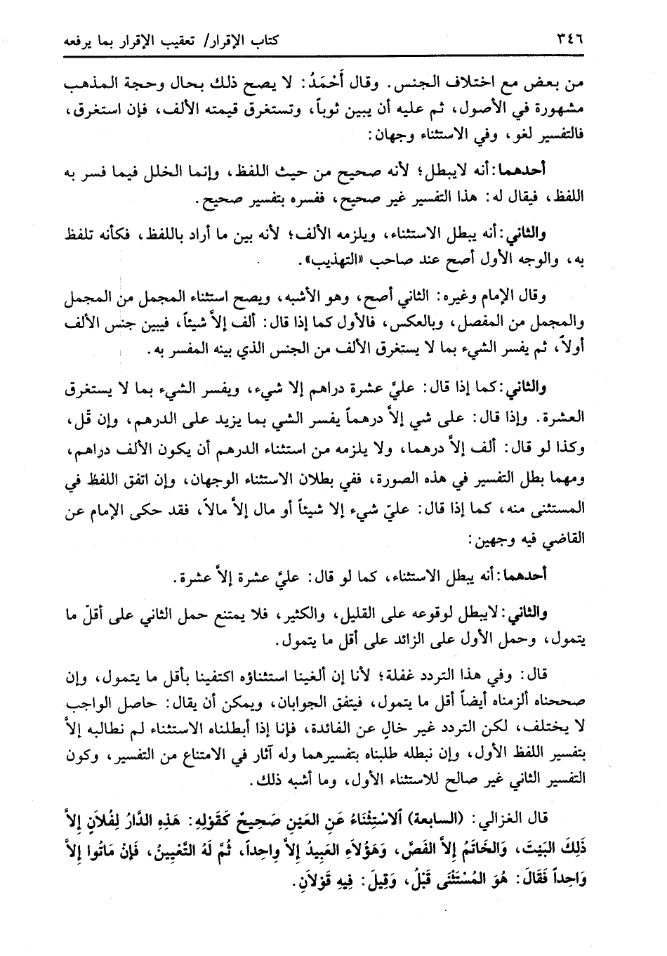 والثاني: كما إذا قال: عليَّ عشرة دراهم إلا شيء، ويفسر الشيء بما لا يستغرق العشرة. وإذا قال: على شي إلاَّ درهماً يفسر الشي بما يزيد على الدرهم، وإن قّل، وكذا لو قال: ألف إلاَّ درهما، ولا يلزمه من استثناء الدرهم أن يكون الألف دراهم، ومهما بطل التفسير في هذه الصورة، ففي بطلان الاستثناء الوجهان، وإن اتفق اللفظ في المستثنى منه، كما إذا قال: عليّ شيء إلا شيئاً أو مال إلاَّ مالاً، فقد حكى الإمام عن القاضي فيه وجهين: