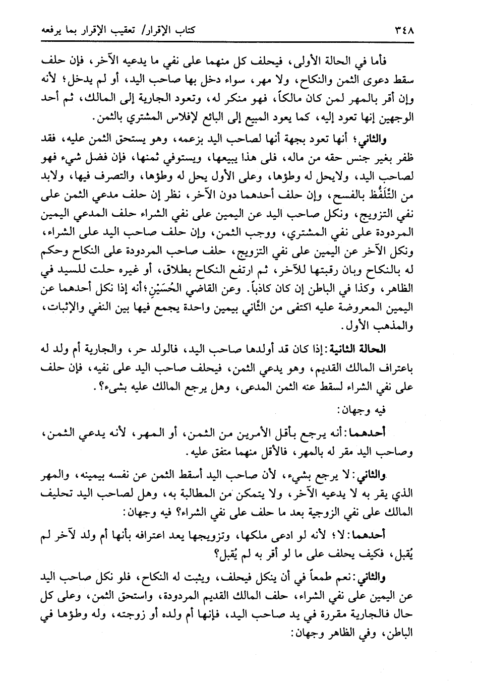 والثاني؛ أنها تعود بجهة أنها لصاحب اليد بزعمه، وهو يستحق الثمن عليه، فقد ظفر بغير جنس حقه من ماله، فلى هذا يبيعها، ويسوفي ثمنها، فإن فضل شيء فهو لصاحب اليد، ولايحل له وطؤها، وعلى الأول يحل له وطؤها، والتصرف فيها، ولابد من التَّلَفُّظ بالفسح، وإن حلف أحدهما دون الآخر، نظر إن حلف مدعي الثمن على نفي التزويج، ونكل صاحب اليد عن اليمين على نفي الشراء حلف المدعي اليمين المردودة على نفي المشتري، ووجب الثمن، وإن حلف صاحب اليد على الشراء، ونكل الآخر عن اليمين على نفي التزويج، حلف صاحب المردودة على النكاح وحكم له بالنكاح وبأن رقبتها للآخر، ثم ارتفع النكاح بطلاق، أو غيره حلت للسيد في الظاهر، وكذا في الباطن إن كان كاذبًا. وعن القاضي الحُسَيْنِ، أنه إذا نكل أحدهما عن اليمين المعروضة عليه اكتفى من الثَّاني بيمين واحدة يجمع فيها بين النفي والإثبات، والمذهب الأول.