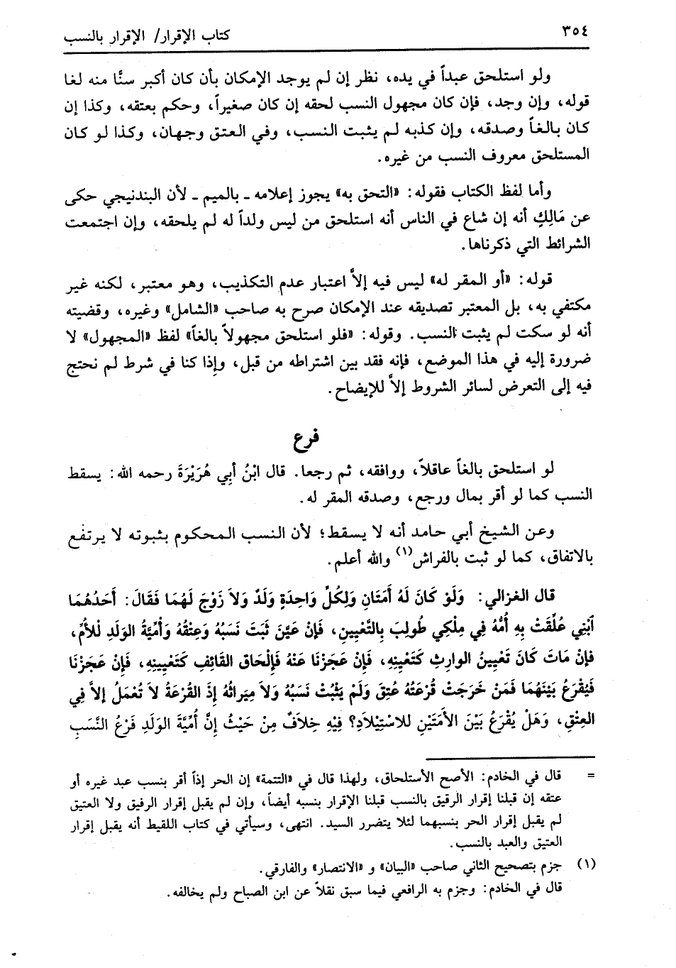 قال الغزالي: وَلَوْ كَانَ لَهُ أَمَتَانِ وَلِكُلِّ وَاحِدَةٍ وَلَدٌ وَلاَ زَوْجَ لَهُمَا فَقَالَ: أَحَدُهُمَا ابْنِي عُلِّقَتْ بِهِ أُمُّهُ فِي مِلْكِي طُولِبَ بِالتَّعْيِينِ، فَإِنْ عَيَّنَ ثَبَتَ نَسَبُهُ وَعِتْقُهُ وَأمِّيَّةُ الوَلَدِ لْلأُمِّ، فإنْ مَاتَ كَانَ تَعْيِينُ الوارِثِ كَتَعْيِنِهِ، فَإِنْ عَجَزْنَا عَنْهُ فَإِلْحَاق القَائِفِ كَتَعْيِينِهِ، فَإنْ عَجَزْنَا فَيُقْرَعُ بَيْنَهُمَا فَمَنْ خَرَجَتْ قُرْعَتُة عُتِقَ وَلَمْ يَثْبُتْ نَسَبُهُ وَلاَ مِيَراثُهُ إِذَ القُرْعَةُ لاَ تُعْمَلُ إلاَّ فِي العِتْقِ، وَهَلْ يُقْرَعُ بَيْنَ الأَمَتَيْنِ للاسْتِيْلاَدِ؟ فِيهِ خِلاَفٌ مِنْ حَيْثُ إِنَّ أُمِّيَّةَ الوَلَدِ فَرْعُ النَّسَبِ