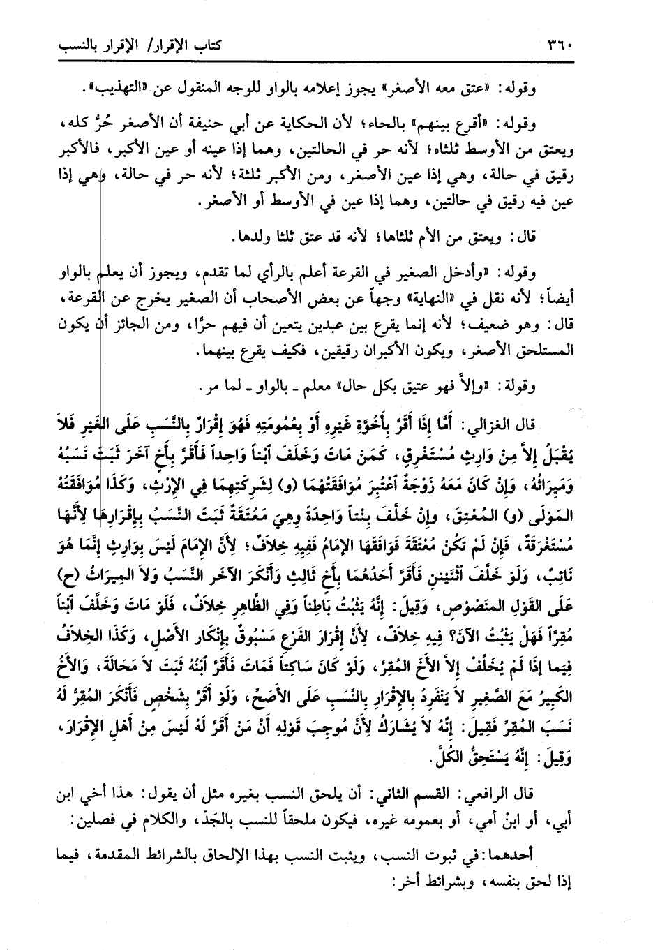 قال الغزالي: أَمَّا إِذَا أَقَرَّ بِأَخُوَّةِ غَيْرِهِ أَوْ بِعُمُومَتِهِ فَهُوَ إِقْرَارٌ بِالنَّسَبِ عَلَى الغَيْرِ فَلاَ يُقْبَلُ إِلاَّ مِنْ وَارِثٍ مُسْتَغْرِقٍ، كَمَنْ مَاتَ وَخَلَفَ ابْناً وَاحِداً فَأَقَرَّ بِأَخٍ آخَرَ ثَبَتَ نَسَبُهُ وَمَيِرَاثُهُ، وَإِنْ كَانَ مَعَهُ زَوْجَةٌ اعْتُبِرَ مُوَافَقَتُهُمَا (و) لِشَرِكَتِهِمَا في الإِرْثِ، وَكَذَا مُوَافَقَتُهُ المَوْلَى (و) المُعْتِقَ، وإِنْ خَلَّفَ بِنْتًا وَاحِدَةً وِهِيَ مَعُتَقَةٌ ثَبَتَ النَّسَبُ بِإقْرَارِها لِأَنَّهَا مُسْتَغْرَقَة، فَإِنْ لَمْ تَكُنْ مُعْتَقَةَ فَوَافَقَهَا الإِمَامُ ففِيِهِ خِلاَفٌ؛ لِأَنَّ الإِمَامَ لَيْسَ بِوَارِثٍ إِنَّمَا هُوَ نَائِبٌ، وَلَوْ خَلَّفَ اثْنَيْنِ فَأَقَرَّ أَحَدُهُمَا بِأخٍ ثَالِثٍ وَأَنْكَرَ الأخَر النَّسَبُ وَلاَ المِيرَاثُ (ح) عَلَى القَوْلِ المنَصْوُصِ، وَقِيلَ: إِنَّهُ يَثْبُتُ بَاطِنًا وَفِي الظَّاهِرِ خِلاَفٌ، فَلَوْ مَاتَ وَخَلَّفَ ابْنًا مُقِرَّاً فَهَلْ يَثْبُتُ الآنَ؟ فِيهِ خِلاَفٌ، لِأَنَّ إِقْرَارَ الفَرْعِ مَسْبُوقٌ بِإنْكَار الأَصْلِ، وَكَذَا الخِلاَفُ فِيَما إِذَا لَمْ يُخَلِّف إِلاَّ الأَخَ المُقِرَّ، وَلَوْ كَانَ سَاكِتًا فَمَاتَ فَأَقَرَّ ابْنُهُ ثَبَتَ لاَ مَحَالَةَ، وَالأَخُ الكَبِيرُ مَعَ الصَّغِيرِ لاَ يَنْفَرِدُ بِالإِقْرَارِ بِالنَّسَبِ عَلَى الأَصَحِّ، وَلَوْ أَقَرَّ بِشَخْصٍ فأَنْكَرَ المُقِرُّ لَهُ نَسَبَ المُقِرِّ فَقِيلَ: إِنَّهُ لاَ يُشَارَكُ لِأَنَّ مُوجِبَ قَوْلِهِ أَنَّ مَنْ أَقَرَّ لَهُ لَيْسَ مِنْ أَهْلِ الإِقْرَارَ، وَقِيلَ: إِنَّهُ يَسْتَحِقُّ الكُلَّ.