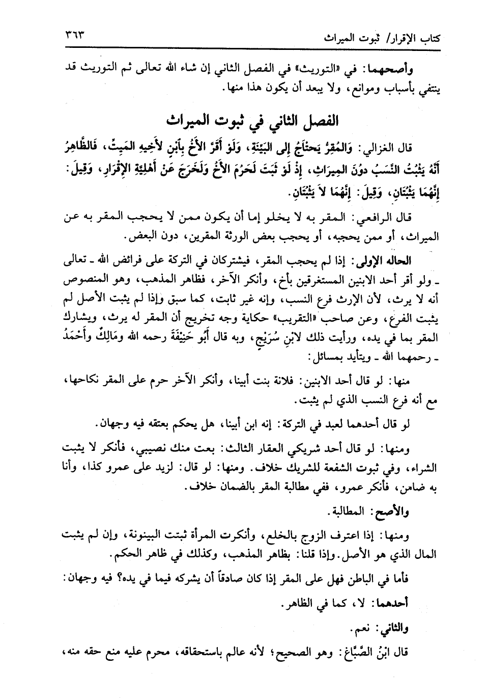 قال الغزالي: وَالمُقِرُّ يَحْتاَجُ إِلى البَيِّنَةِ، وَلَوْ أَقَرَّ الأَخُ بِابْنٍ لأَخِيهِ المَيِتِّ، فَالظَّاهِرُ أنَّهُ يَثْبُتُ النَّسَبُ دوُنَ المِيرَاثِ، إِذْ لَوْ ثَبَتَ لَحَرُمَ الأَخُ وَلَخَرَجَ عَنْ أَهْلِيَّةِ الإِقْرَارِ، وَقِيلَ: إِنَّهُمَا يَثْبُتَانِ، وَقِيلَ: إِنَّهُمَا لاَ يَثْبتَانِ.