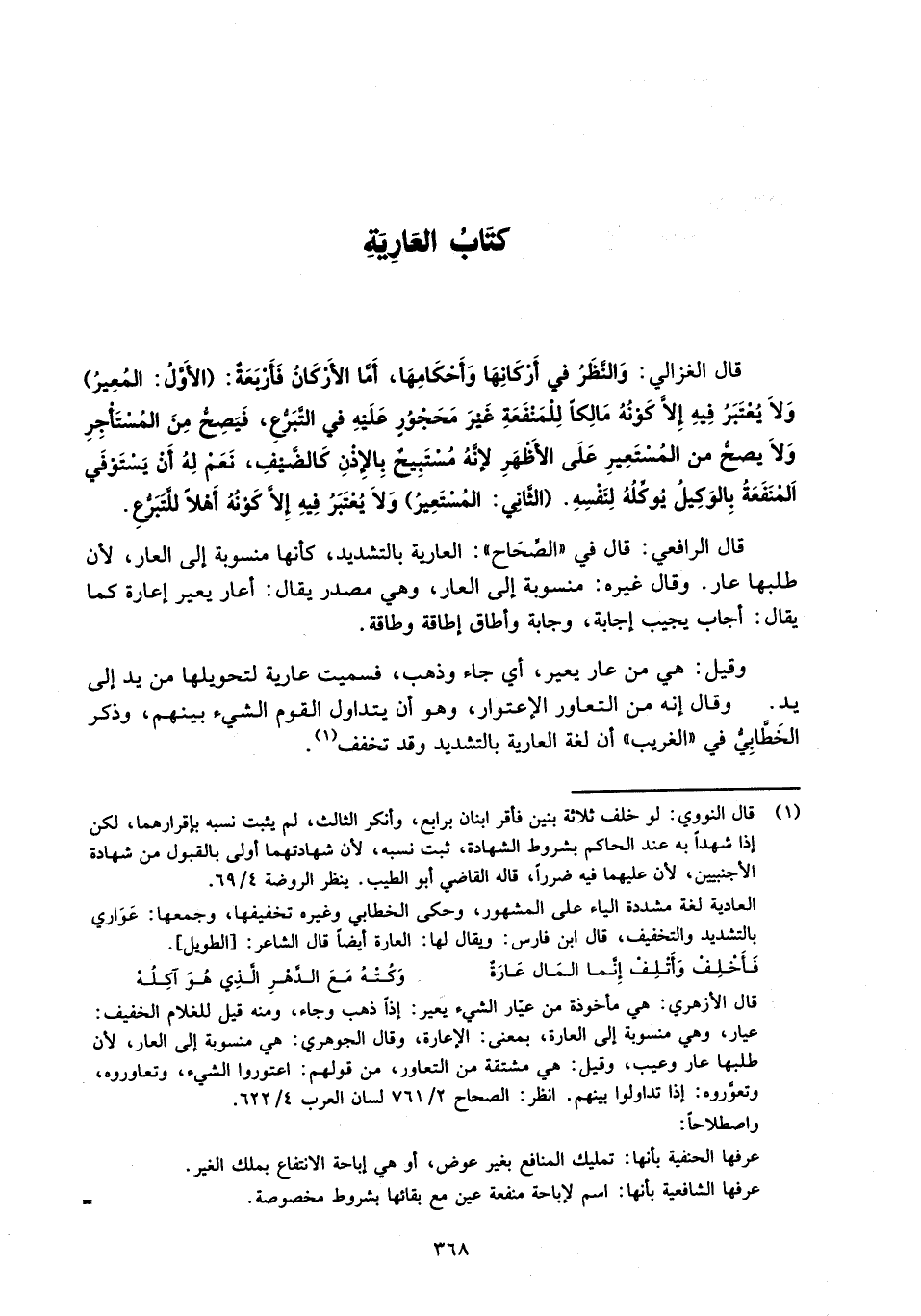 قال الرافعي: قال في "الصِّحَاح": العارية بالتشديد، كأنها منسوبة إلى العار؛ لأن طلبها عار. وقال غيره: منسوبة إلى العار، وهي مصدر يقال: أعار يعير إعارة كما يقال: أجاب يجيب إجابة، وجابة وأطاق إطاقة وطاقة.