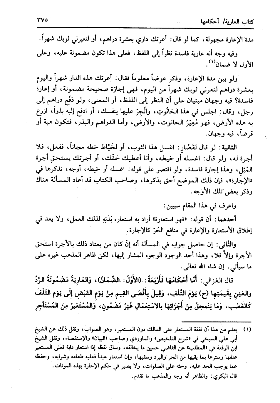 قال الغزالي: أَمَّا أَحْكَامُهَا فأَرْبَعَةٌ: (الأَوَّلُ: الضَّمَانُ)، وَالعَارِيَةُ مَضْمُونَةُ الرَّدِّ والعَيْنِ يِقَيمَتِهِا (ح) يَوْمَ التَّلَفِ، وَقِيلَ بِأَقْصَى القِيم مِنْ يَوْمِ القبْضِ إِلَى يَوْم التَلَفَ كَالغَصْب، وَمَا يَنْمحِق مِنْ أَجْزَائِهَا بالاسْتِعْمَالِ غَيْرُ مَضْمُونٍ، وَالمُسْتَعَيرُ مِنَ المُسْتَأجِرِ
