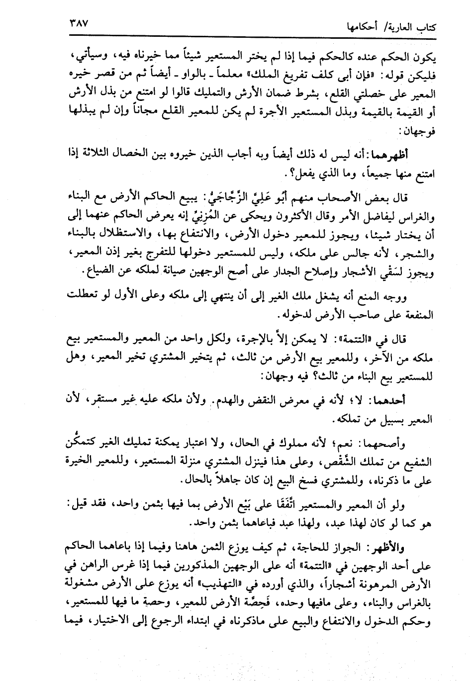 قال بعض الأصحاب منهم أبُو عَلِيَّ الزَّجَّاجَيُّ: يبيع الحاكم الأرض مع البناء والغراس ليفاضل الأمر وقال الأكثرون ويحكى عن المُزِنِيِّ إنه يعرض الحاكم عنهما إلى أن يختار شيئا، ويجوز للمعير دخول الأرض، والانتفاع بها، والاستظلال بالبناء والشجر؛ لأنه جالس على ملكه، وليس للمستعير دخولها للتفرج بغير إذن المعير، ويجوز لسَقْي الأشجار وإصلاح الجدار على أصح الوجهين صيانة لملكه عن الضياع.